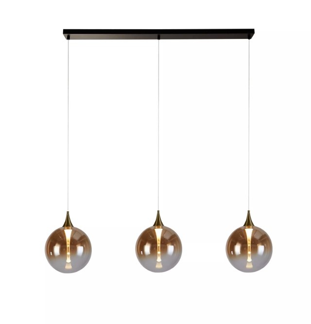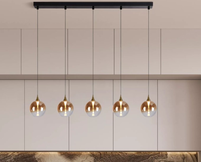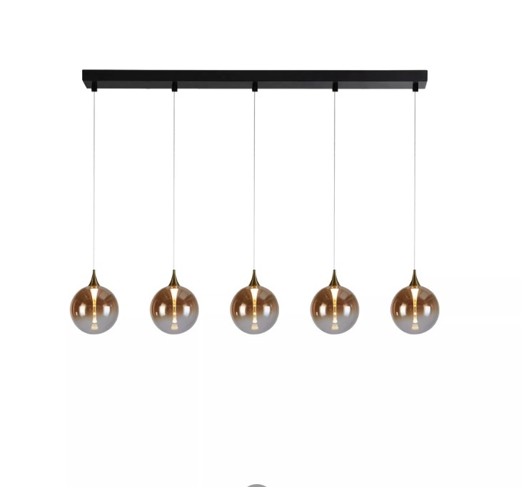 From the Alchemy series, a 3 or 5-light pendant lamp on a beam with 3 or 5 glass shades. A black beam measuring 68 or 120 cm. 3 or 5 round glass shades hang from this plate. Each glass shade has a light output of 19 watts at 3000 Kelvin, ensuring good visibility.