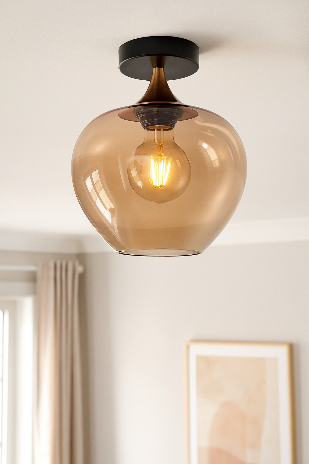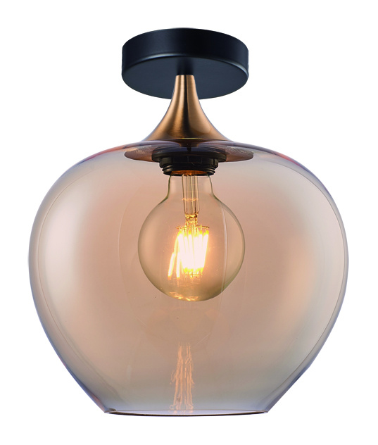 Fresu bronze/gold ceiling lamp with amber glass on a 10 cm diameter ceiling plate. The diameter of the glass shade is 24 cm. (Because each glass is handmade, there may be small air bubbles or imperfections.)