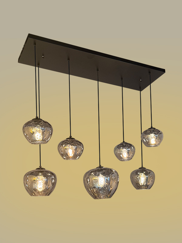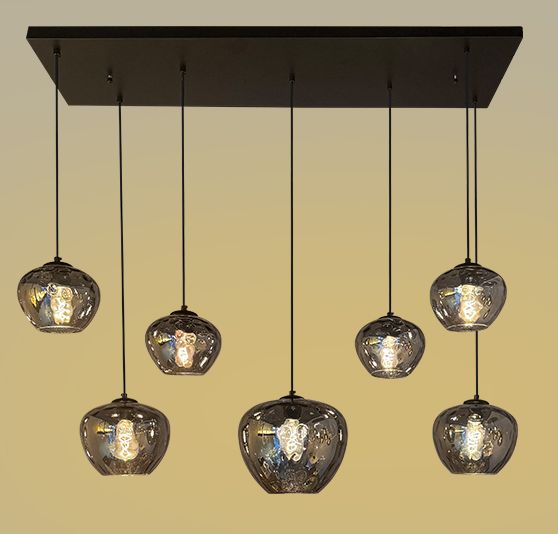Apple pendant lamp with 7 lights, featuring a black ceiling plate measuring 120 x 35 cm. New glass (with a small dent) is available in three different sizes, in amber or smoked gray.