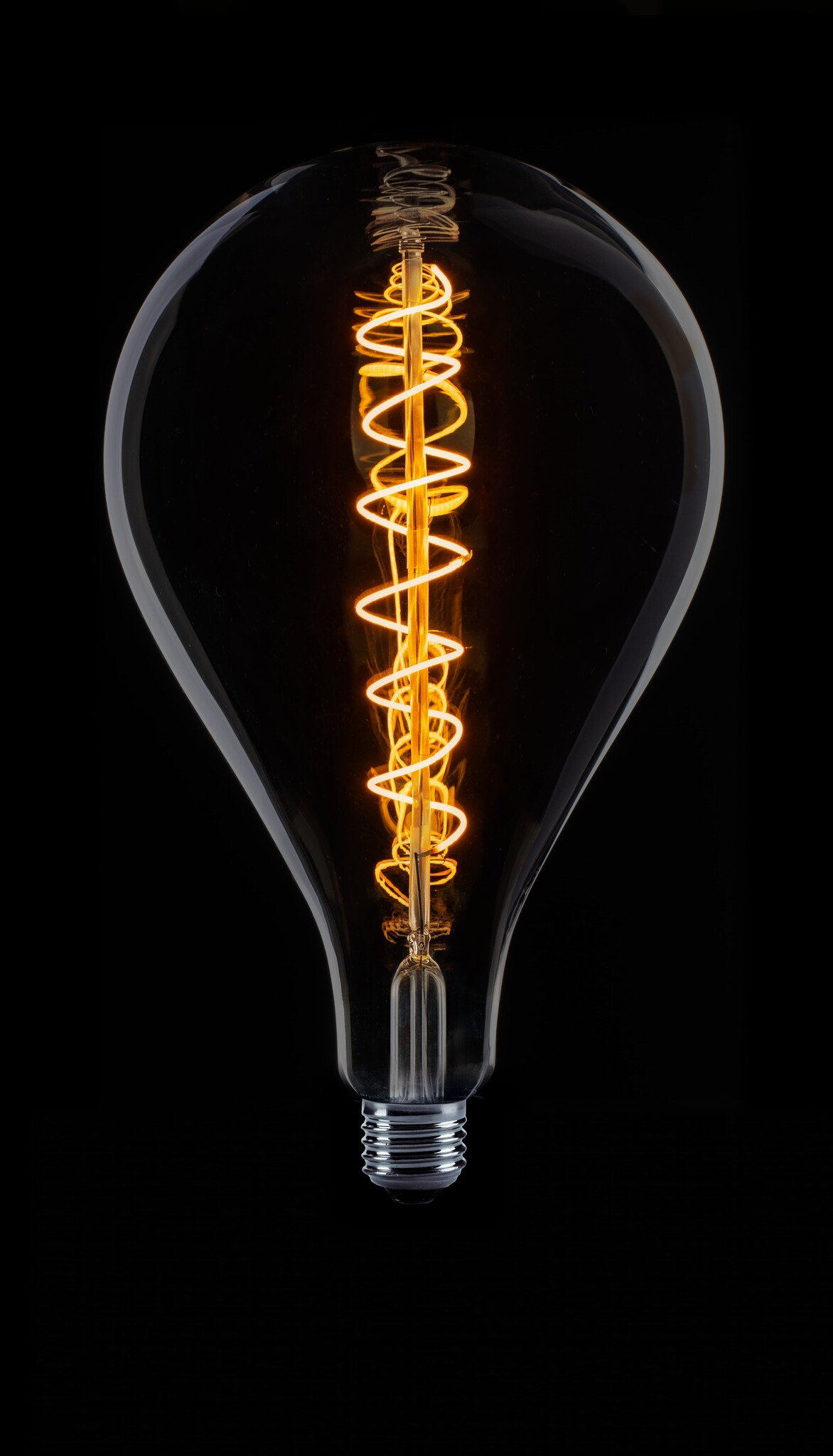 Large incandescent bulb model. XXL filament Led 7 watt / 3 steps dimmable / E27 Lumen. Dimensions large incandescent bulb model 28.5 cm high x diameter 16 cm diameter. Led Carbon filament inside curl-spiral design. (2100 Kelvin) 7 watt, 3.5 watt and 1 watt.
