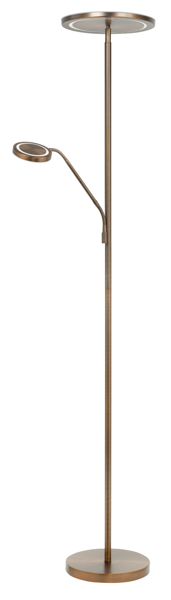 The Alicante floor lamp, available in stainless steel or bronze, features a reading arm and a single bowl on top. This uplighter has two pulse dimmers located halfway up the stem. This Alicante has a color-change function. The base plate has a diameter of 23 cm.