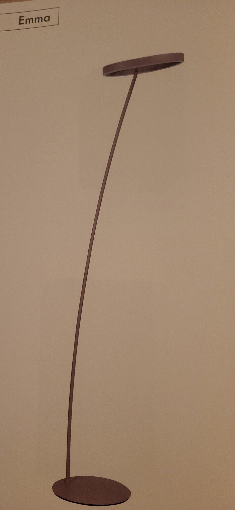 Emma floor lamp, with a slight arc and a ring at the top that has an integrated 40-watt LED, which is also dimmable.