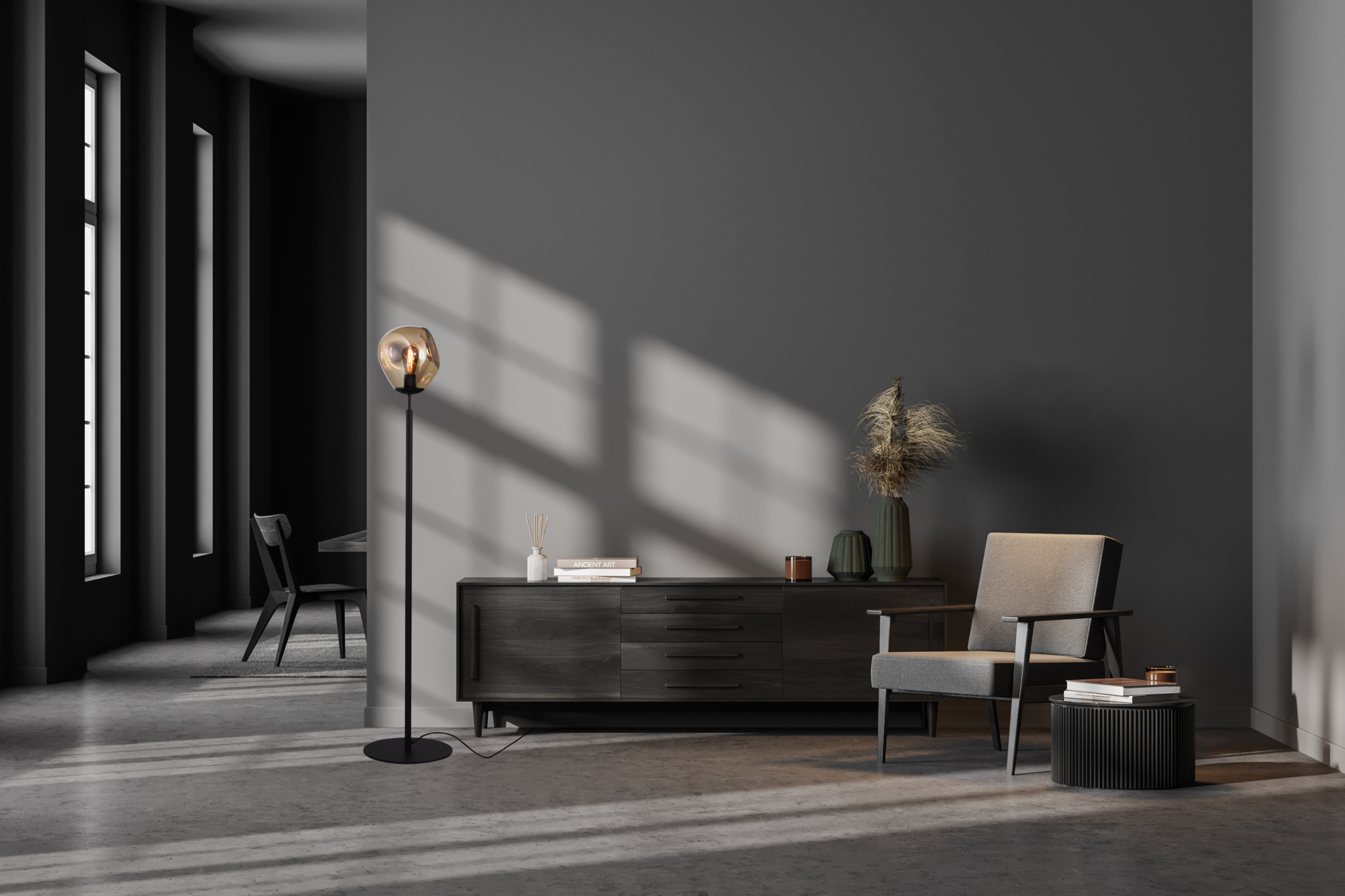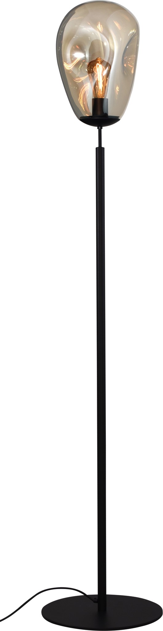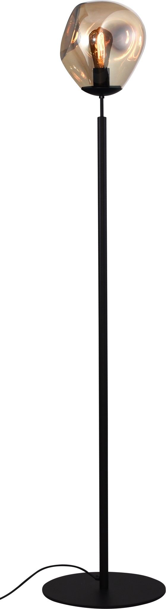 New black Lava floor lamp with one light. Height 162 cm or 171 cm. Gold-colored glass with a diameter of 22 or 24 cm. Base plate 35 cm. With on/off switch.
