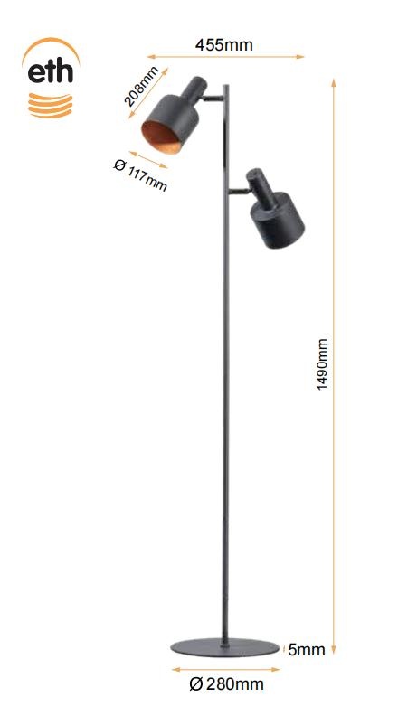 The Sledge is a black metal floor lamp with two adjustable and tilting shades. It can accommodate two bulbs of up to 60 watts. The inside of the shades is a copper-like color.