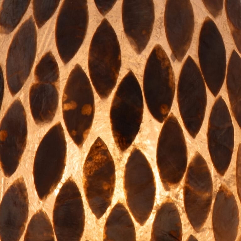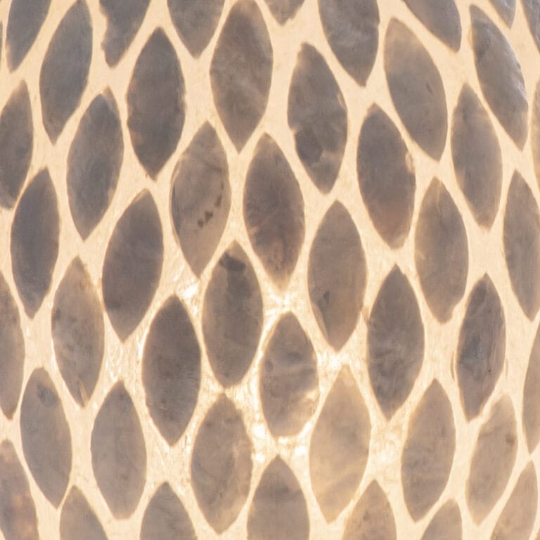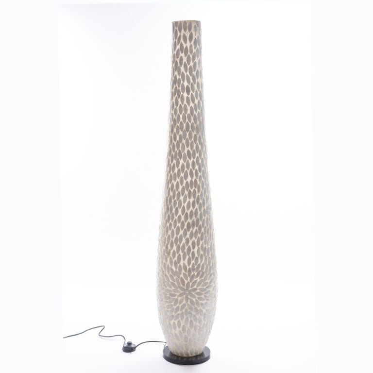 Flower Gold floor lamp in brown or white mother-of-pearl. These lamps are covered with Capiz shells on a fiberglass mold. The height is 150 cm. Each floor lamp can accommodate three LED bulbs with an E27 socket. It comes with a black cord and an on/off switch.