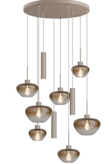 This beautiful and of nice quality 10 light hanging lamp Genua round. A generous ceiling plate of 70 cm with 7 glasses, and 3 x tubes on it. (all suitable for Led, Excl.)