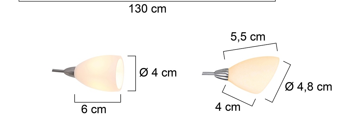 White slanted glass. Suitable for Steinhauer brand lamps. Suitable for lamps with G4 fitting (12 volt) Hole size approximately 11 mm. 6880B, 6880CH, 6880ST, 6949CH, 6949ST, 7045ST, 7046ST, 7047ST, 7050ST, 7051ST, 7052CH, 7052ST, 7053CH, 7053ST, 7054ST, 7055CH, 7055ST, 9218ST, 9221ST, 9224ST, 9227ST, 9230ST. With a height of 5.5 cm and a diameter of 4.8 cm, this glass fits perfectly on the clamp fittings that Steinhauer has been using for years. ( also cream ivory, from the Eglo brand, see also photo pl. lamp 90737)