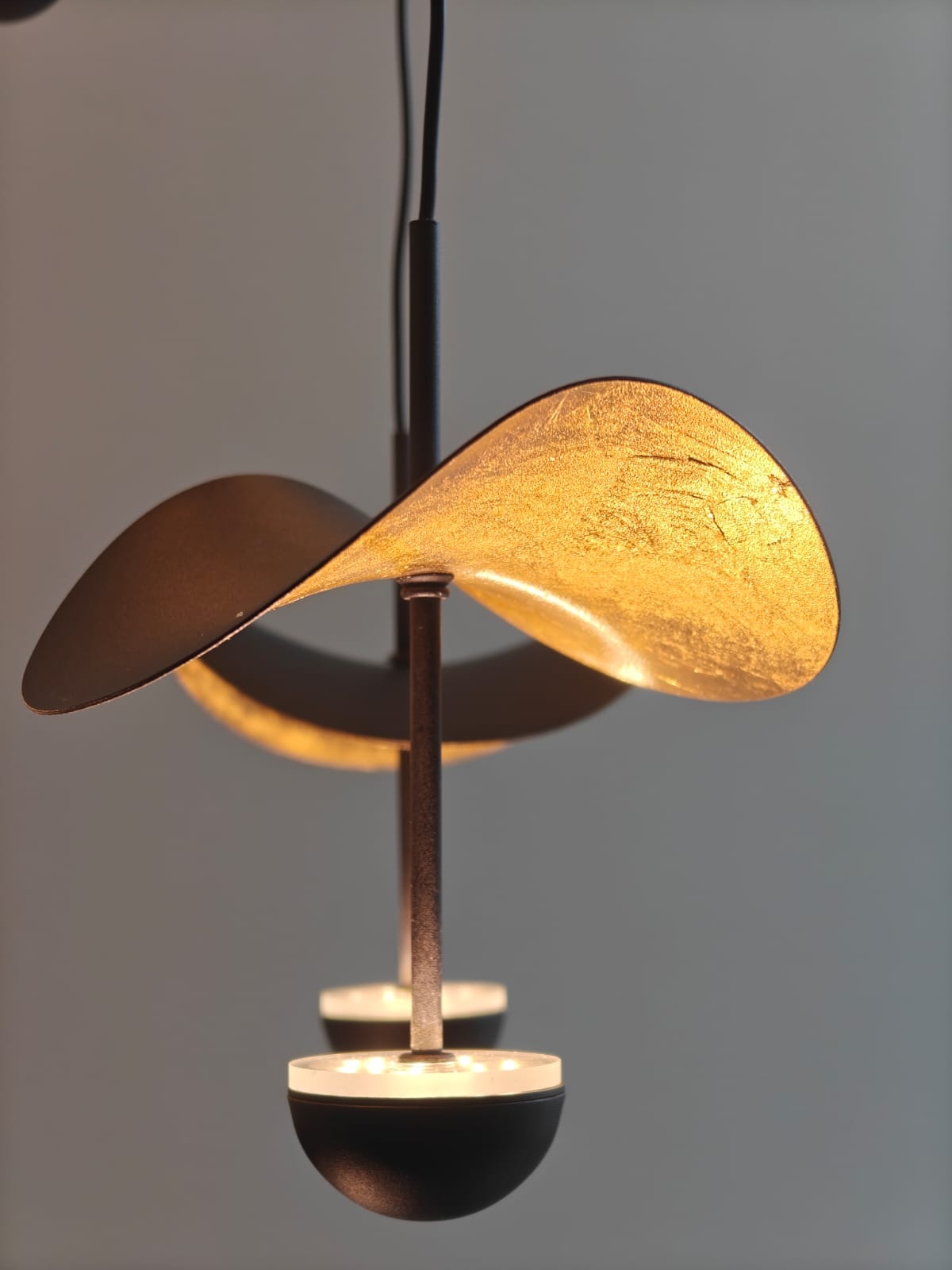 Very special design hanging lamp Dracera with an oval black ceiling plate of 155 x 33 cm. 17 narrow cables come from the ceiling plate with a ball with LED at the end. This LED radiates back against a beautiful gold curved leaf, which spreads an atmospheric light. In short, the oval design hanging lamp Dracera with 17 light sources of 2.3 watt LED is a must-have for anyone looking for a statement piece.