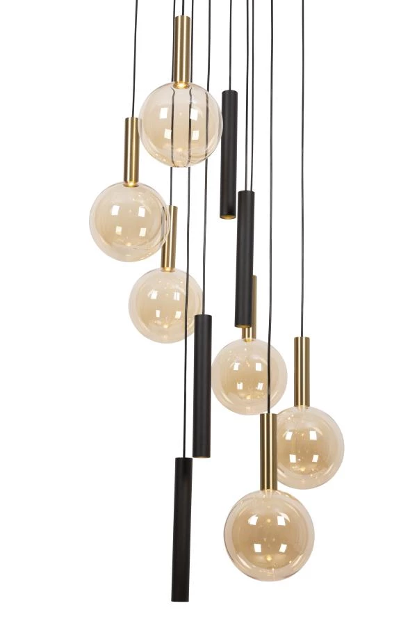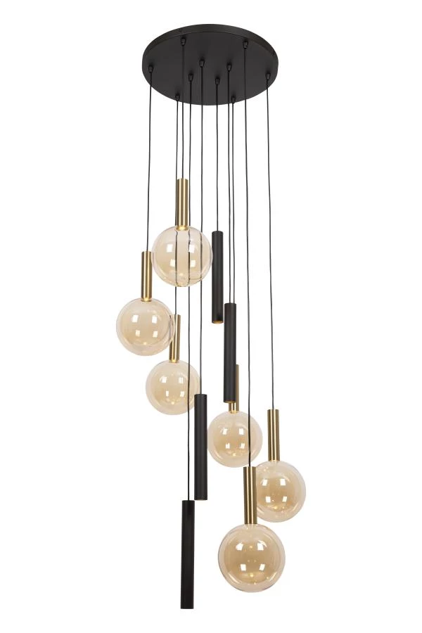Josiane round pendant lamp, 10 lights, with a 45 cm matt black round ceiling plate, with 6 round glasses (amber) and 4 tubes. (excl. LED GU10/MR11) Height 280 cm. The glass is closed at the bottom.
