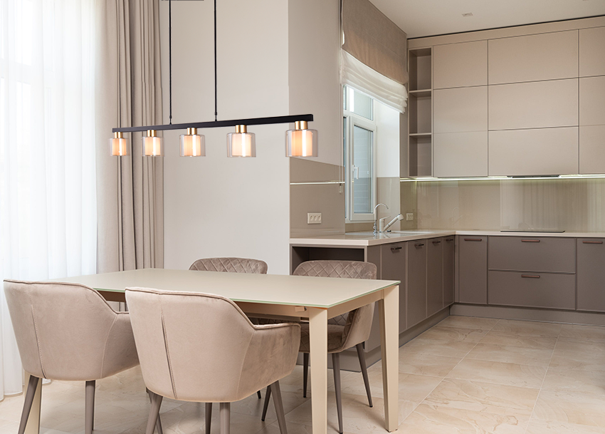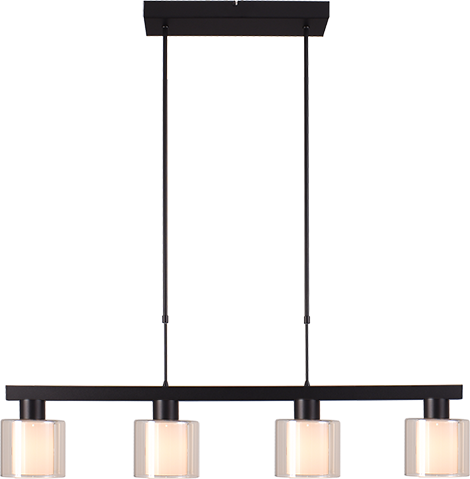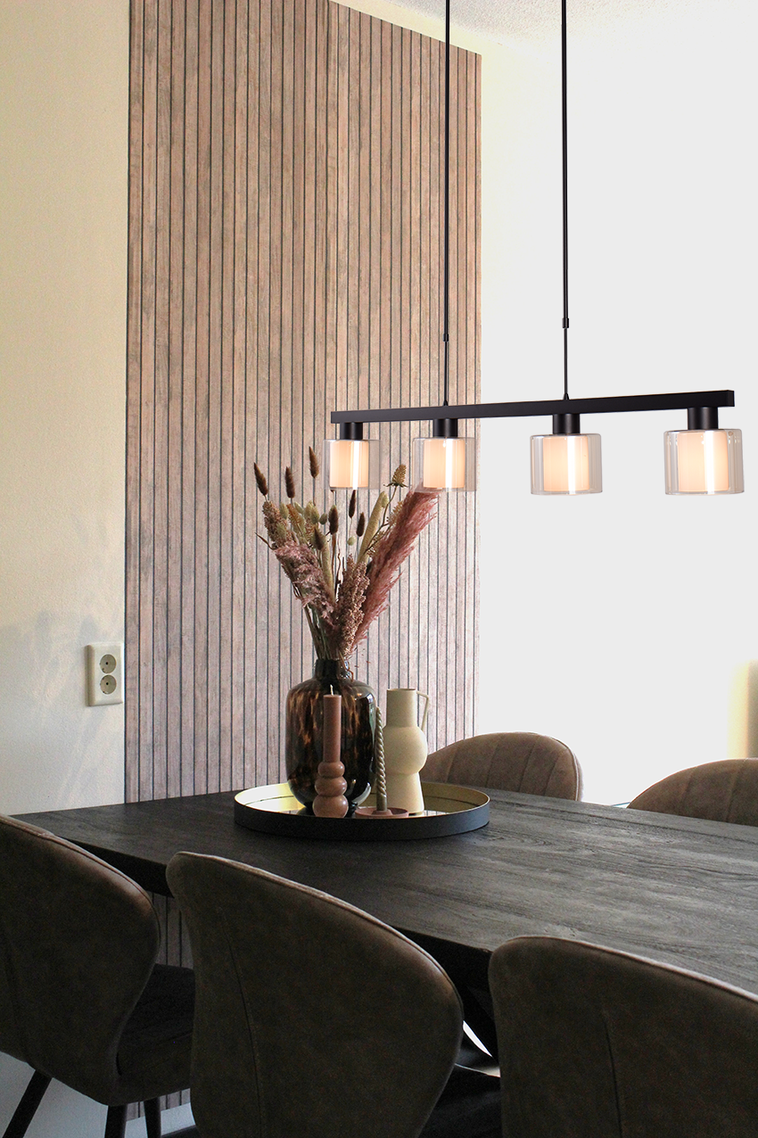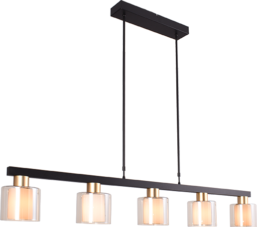 This beautifully finished Laurie pendant lamp features five glass shades and is 130 cm long. Five glasses are located at the bottom, all shining downward, providing ample light on the table. Height is adjustable using an Allen key. This lamp is compatible with dimmable E27 LED bulbs. Available in all-black or black with matte gold. The glass diameter is 14 cm and the inner glass diameter is 9 cm. Amber glass.