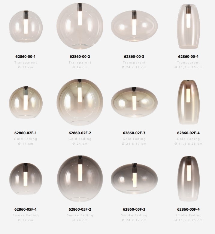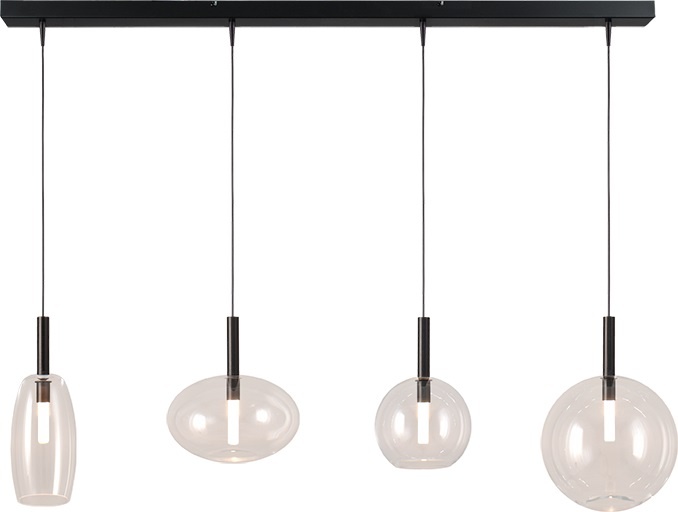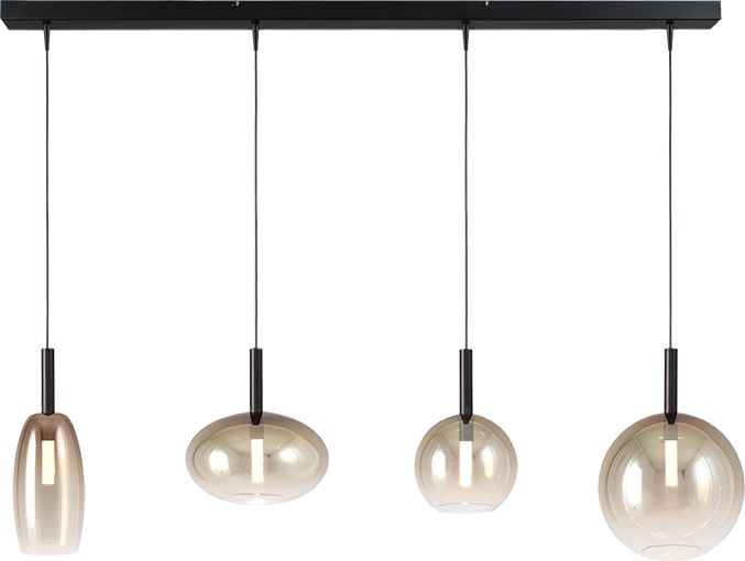 Lido pendant lamp with four lights, featuring black or matte gold pendants and four different glass styles. Ceiling beam: 130 x 8 cm. Integrated LED: 4 x 4.4 watts, 2200-2700 Kelvin. Dim-to-warm function. Cord: 150 cm. Pendant/rod: 11 cm high.