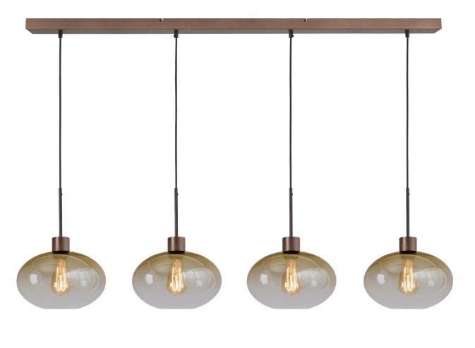 Sun Cipolla 4-light pendant lamp. The cocoa-colored ceiling beam measures 130 cm x 8 cm, with four 28 cm diameter glasses. The glasses have a subtle gold color (gold fading), which fades downward.