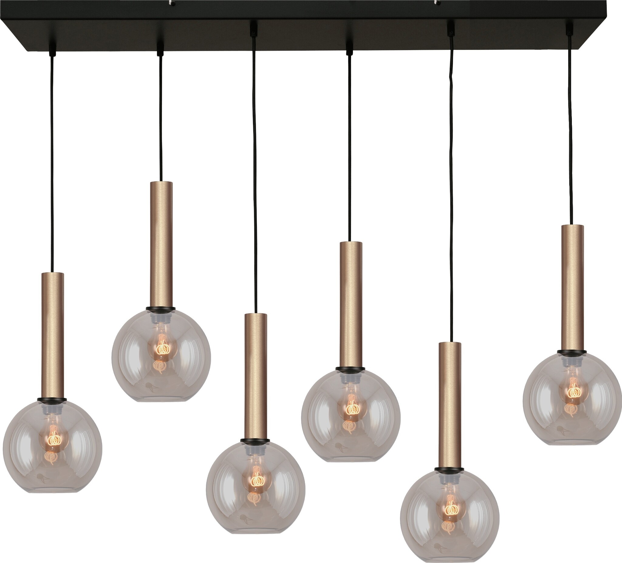 Bella 2 pendant lamp with 5 beautiful glass pendants. The ceiling beam is 130 cm long x 8 cm wide. The amber smoked glass pendants hang from the beam, which is height-adjustable. The glass has a diameter of 20 cm and is gold fume. Choose from a matte gold or solid black pendant. There may be an air bubble in the glass, which is due to its mouth-blown nature.
