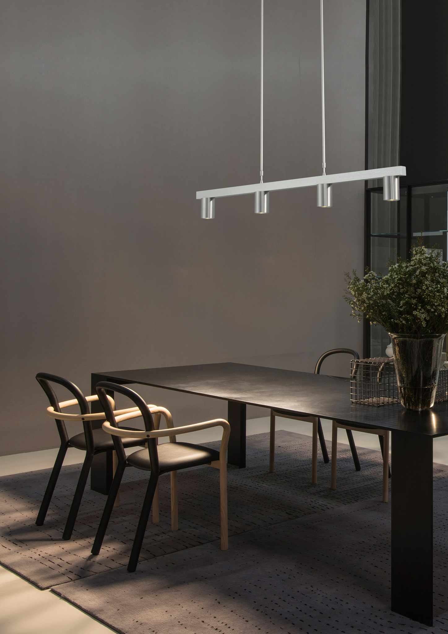 This very beautifully finished Bounce hanging lamp with 4 spotlights has a length of 100 cm x 8 cm wide, with 4 spotlights at the bottom that all shine downwards, providing a lot of light on the table. Height adjustable by means of hexagon socket. This lamp can be supplied with or in or excl. dimmable LED light sources from Osram.