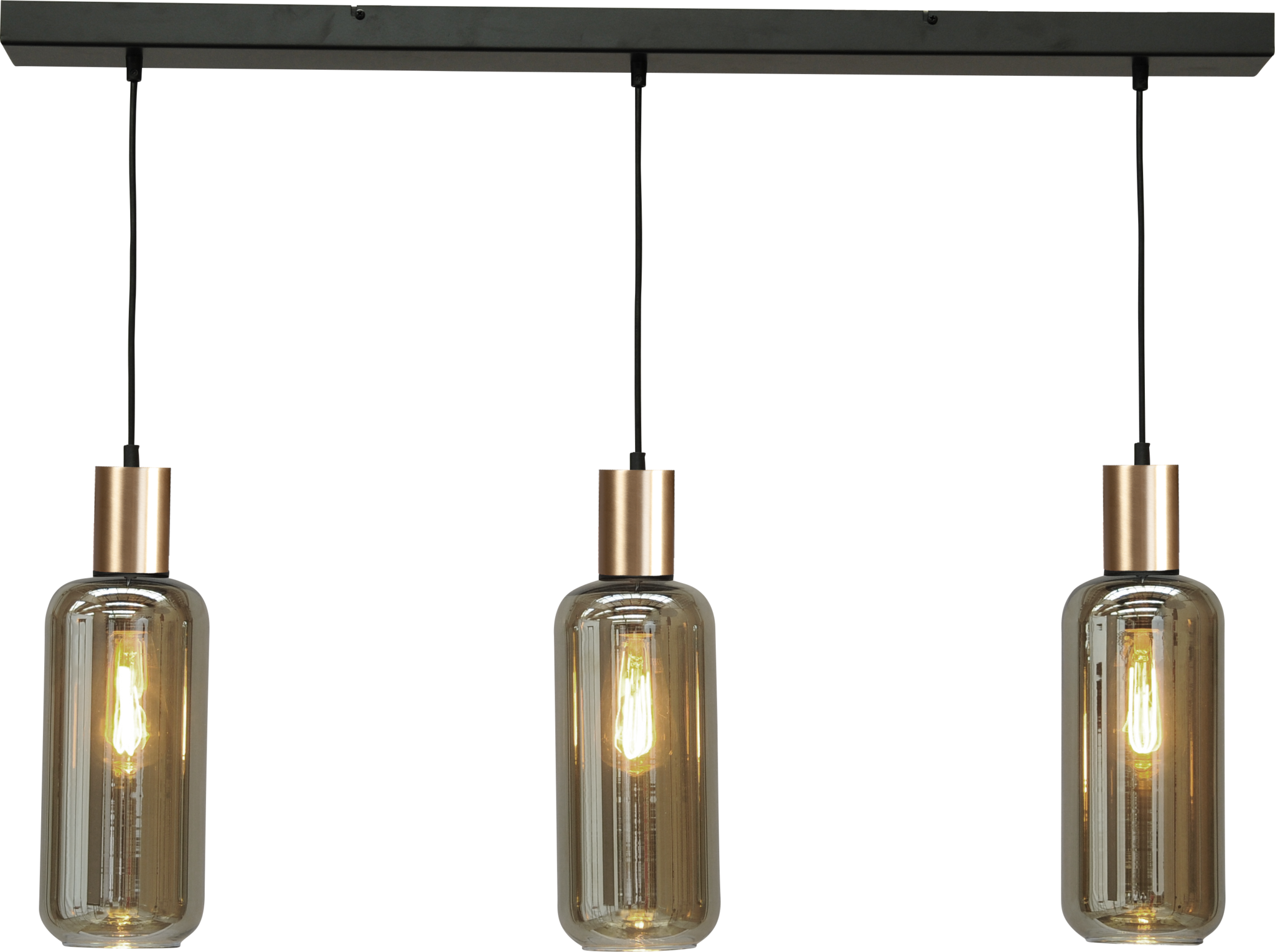 This stylish, trendy pendant lamp from the Quinto series features a 100cm black beam. Three pendants, either with matte gold or solid black fittings, hang from the beam, from which a smoked glass cylinder hangs. (Glass height: 29 x 13cm) The glass can be adjusted for height during installation. The perfect combination for this Bounty lamp is a filament LED bulb. To create the perfect ambiance, we recommend replacing the light switch with an LED dimmer.