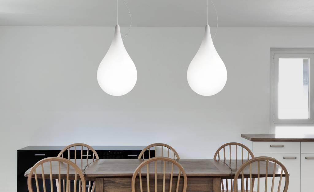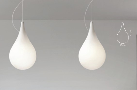Teardrop-shaped pendant lamp in white plastic. Ceiling plate diameter 15 cm. There is a recess on the side in the center of the lamp allowing you to replace the bulb. Very suitable for an LED bulb. Read more