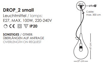 The Drop 2 Small pendant lamp is designed by Hopf & Wortman. This small, aesthetically designed droplet lamp embodies the extraordinary symbolism of light and water. The Drop 2 Mini pendant lamp enhances any room with its pleasant warm light and appears to float weightlessly in the air, creating a unique atmosphere. There are various versions of the droplet lamps from the Liquid Light series. The droplet lamp is made of durable plastic that is fully recyclable. The droplet has a diameter of 27 cm and is 47 cm high. Ideal for an LED bulb.