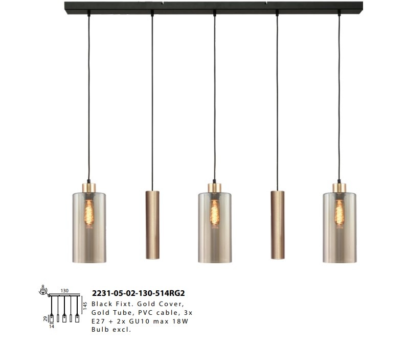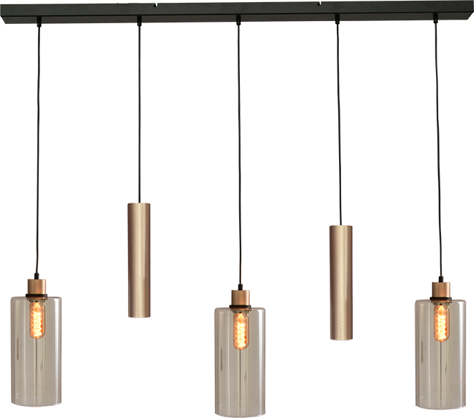 This beautiful and high-quality 5-light Ortona pendant lamp features a black beam measuring 130 x 8 cm, with three oblong glass shades, each 29 cm long and 14 cm in diameter, and two pendant lamp runs attached to it. The Run tube has a GU10 socket. The lamp holder is in matte gold brass.