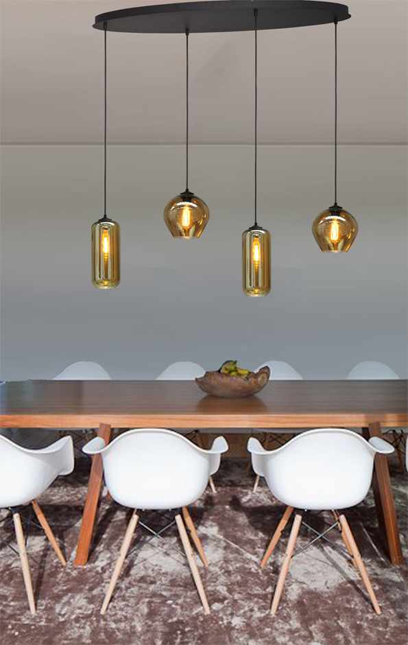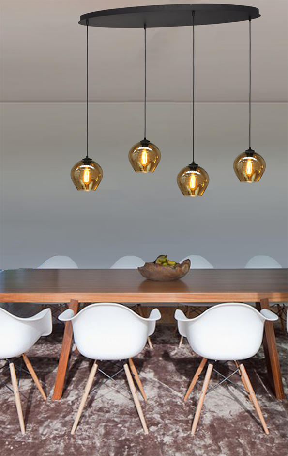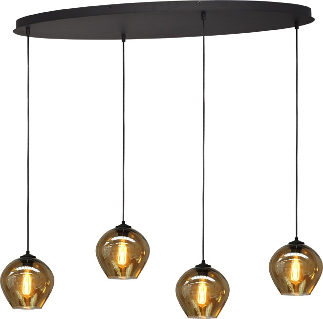 This stylish, trendy pendant lamp features a 100 x 40 cm oval plate from the Quinto series. Four pendants with smoked glass hang from the plate. The glass can be adjusted for height during installation. The perfect combination for this Quinto lamp is the filament LED bulb. The glass is handmade, so variations in finish are always possible. (Please keep this in mind when evaluating the glass.) If you would like a different glass model, please let us know in the comments.