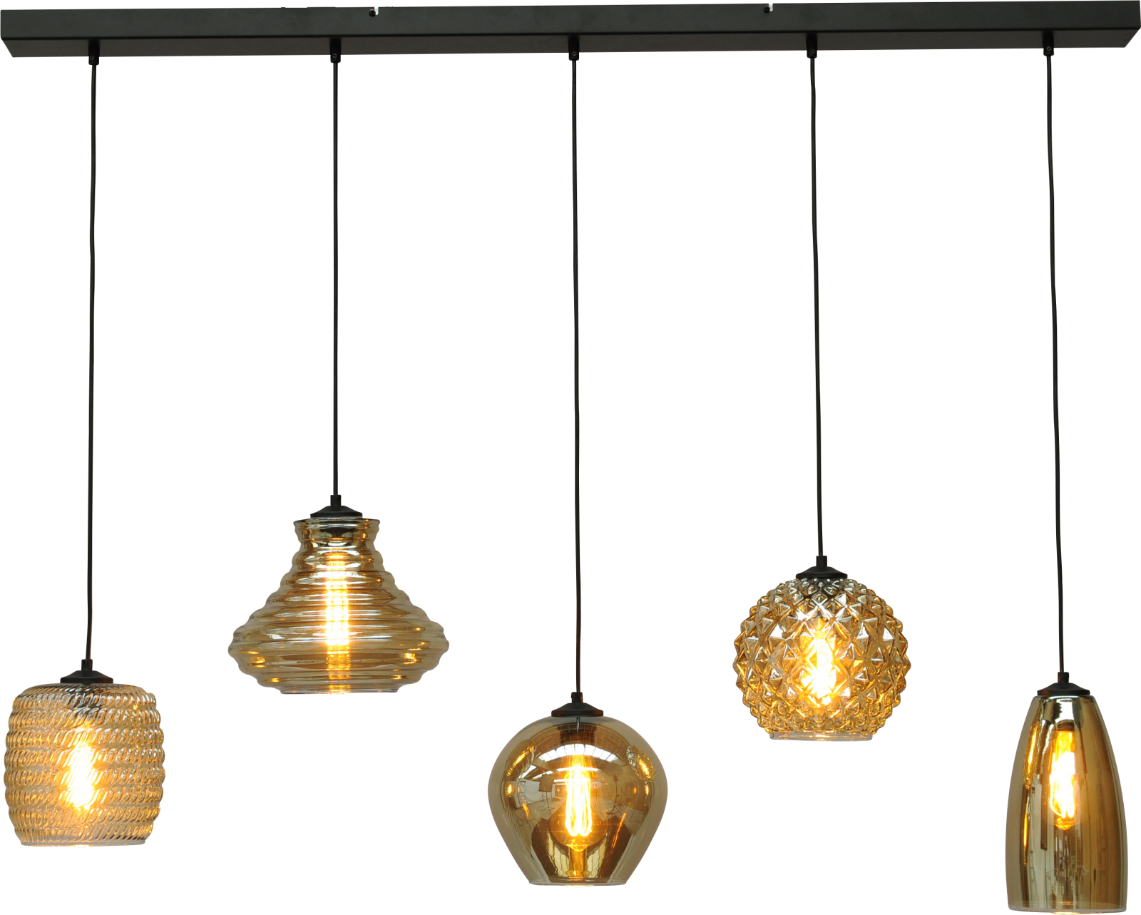 Nice trendy hanging lamp with a black bar of 130 cm X 8 cm, from the Quinto series. 5 pendants with a smoke glass in various shapes hang from the bar. The glasses can be adjusted in height when mounting. The perfect combination in this Quinto lamp is to use the filament LED lamp. To create the right atmosphere, we recommend replacing the light switch for a LED dimmer. The glass is handmade, differences in finish are always possible. (take this into account when assessing the glass) Can be ordered with or without LED lamps filament 5 watts.