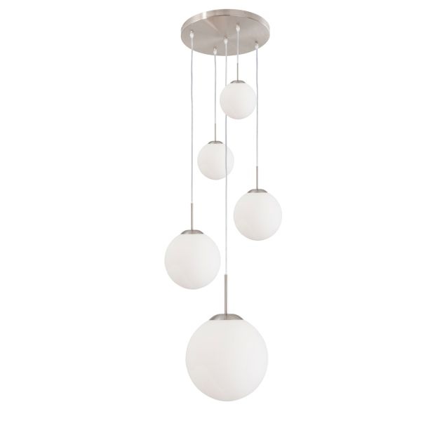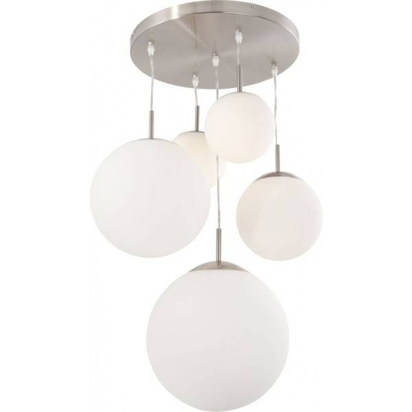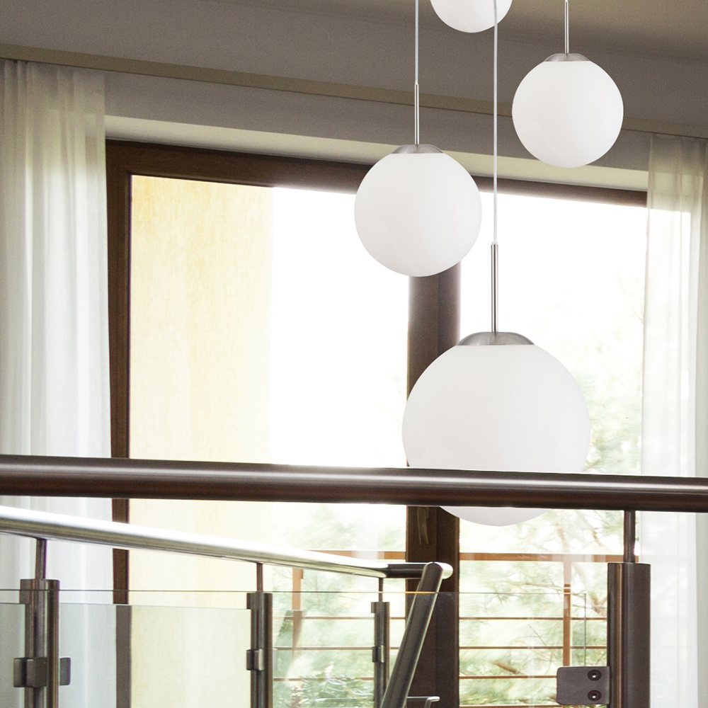 The Bollique pendant lamp features a round stainless steel ceiling plate with a diameter of 40.5 cm, supported by 5 white round glass spheres of various sizes. The total height of this lamp is a maximum of 315 cm, and it is height-adjustable. Each glass sphere can accommodate a maximum wattage of 40 watts with an E27 fitting. Ideal for hanging in a stairwell or atrium.