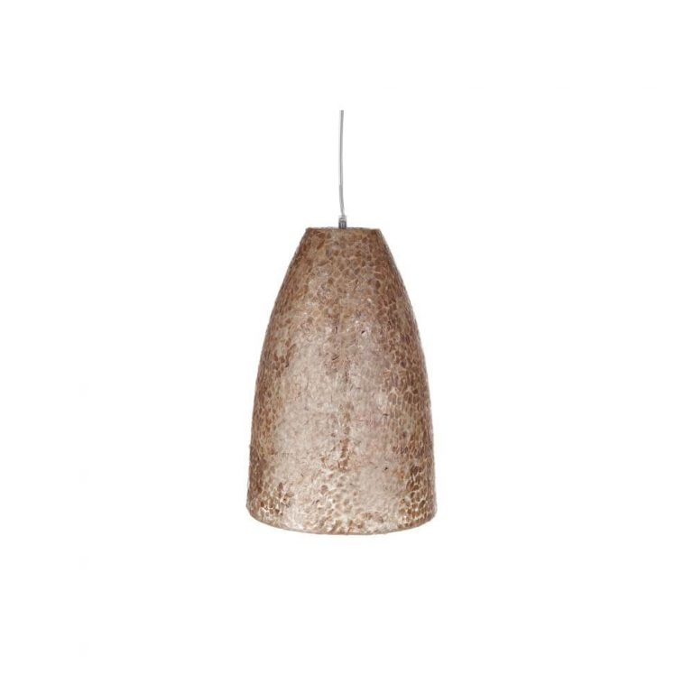Pendant lamp with capiz shell pieces (white mother of pearl) or a mix of cream, brown, and gold on a fiberglass mold in a hemisphere shape. The diameter of this Belle S pendant lamp is 28 cm and the shade is 43 cm high. The lamp hangs from a 125 cm transparent cable. Suitable for LED bulbs. Recommended bulb: E27.