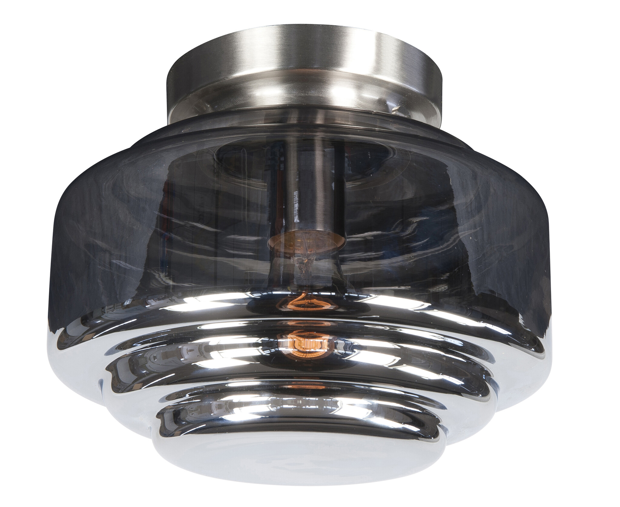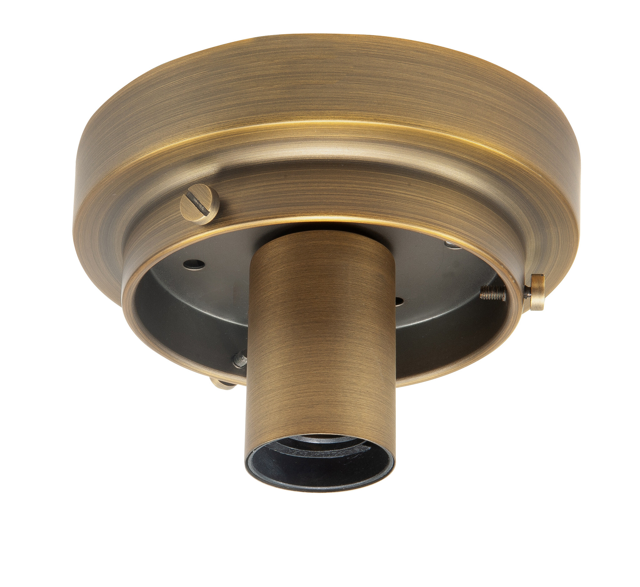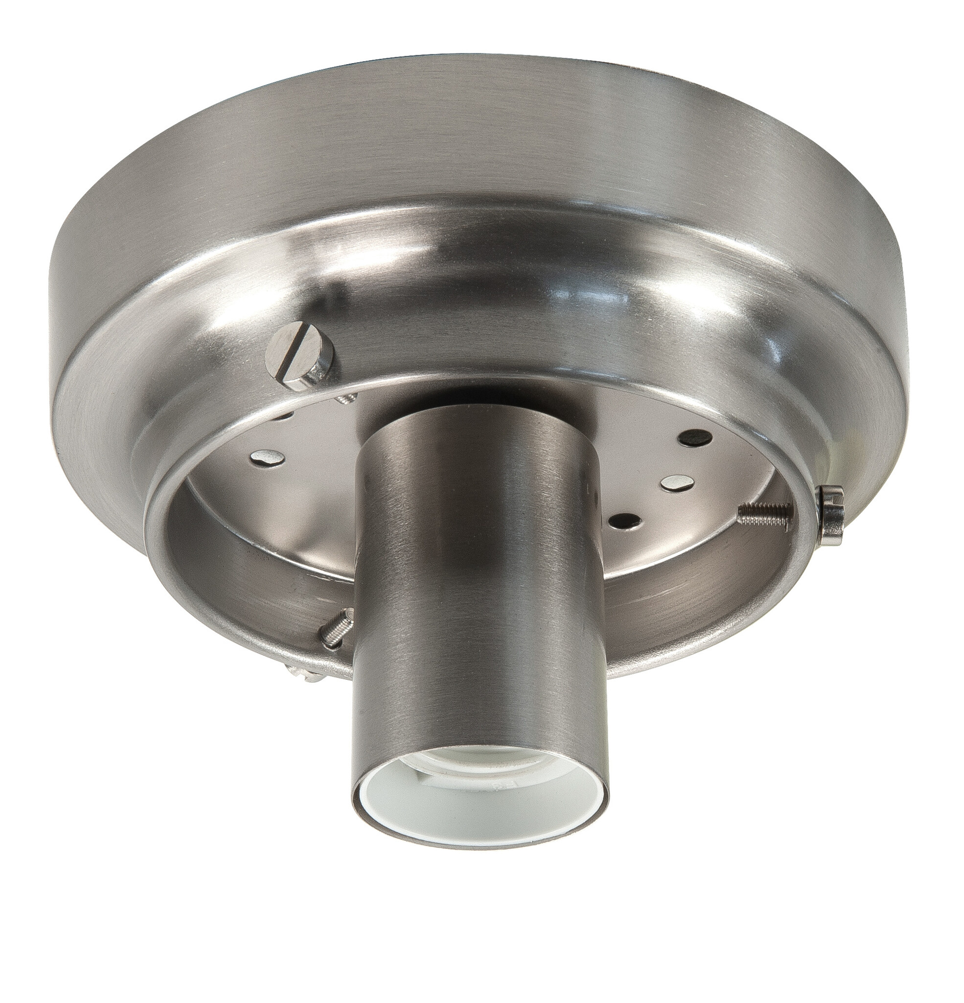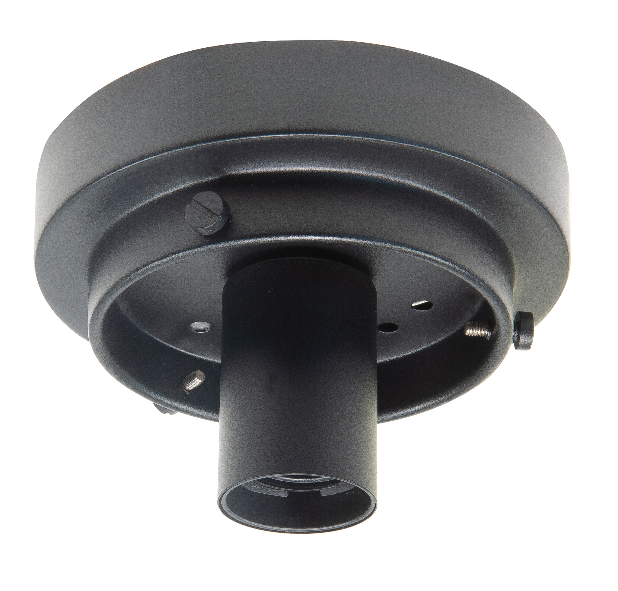 This freestanding ceiling mount for glass is available in stainless steel, bronze, or black with a diameter of 14 cm. It's suitable for attaching a 10 cm diameter glass at the neck using three screws. This ceiling mount is attached to the ceiling with a bracket and secured to the side with two screws. Also available in bronze.