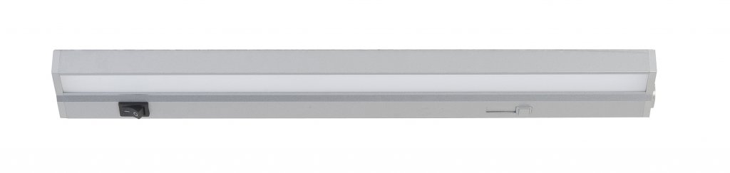 LED fixture for use under a kitchen cabinet, for example. This LED fixture consumes 6.4 watts, making it very energy-efficient. It's 42 cm long and 5.5 cm wide and comes in a metallic color. The LED fixture includes a sliding dimmer and an on/off switch. It comes with a cord and connector for connecting multiple units.