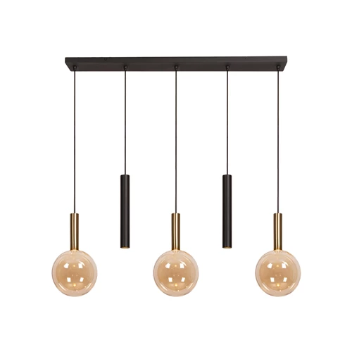 Pendant lamp Josiane 3 + 2 lights with a matt black ceiling plate of 95 x 9.5 cm, with 3 round glasses (amber) and 2 tubes. (excl. Led GU10 / MR11) Height 160 cm. The glass is closed at the bottom. Mounting plate lxwxh 95 cm x 9.5 cm x 2.5 cm