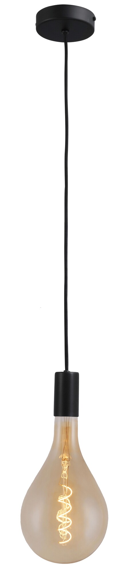 Round black ceiling rose, 10.8 cm, with an E27 pendant. The fabric cable is 2 meters long. This Tessi pendant lamp comes with a 4-watt E27 Gold light source, 280 lumens, a diameter of 15.7 cm, a height of 30 cm, and is dimmable.