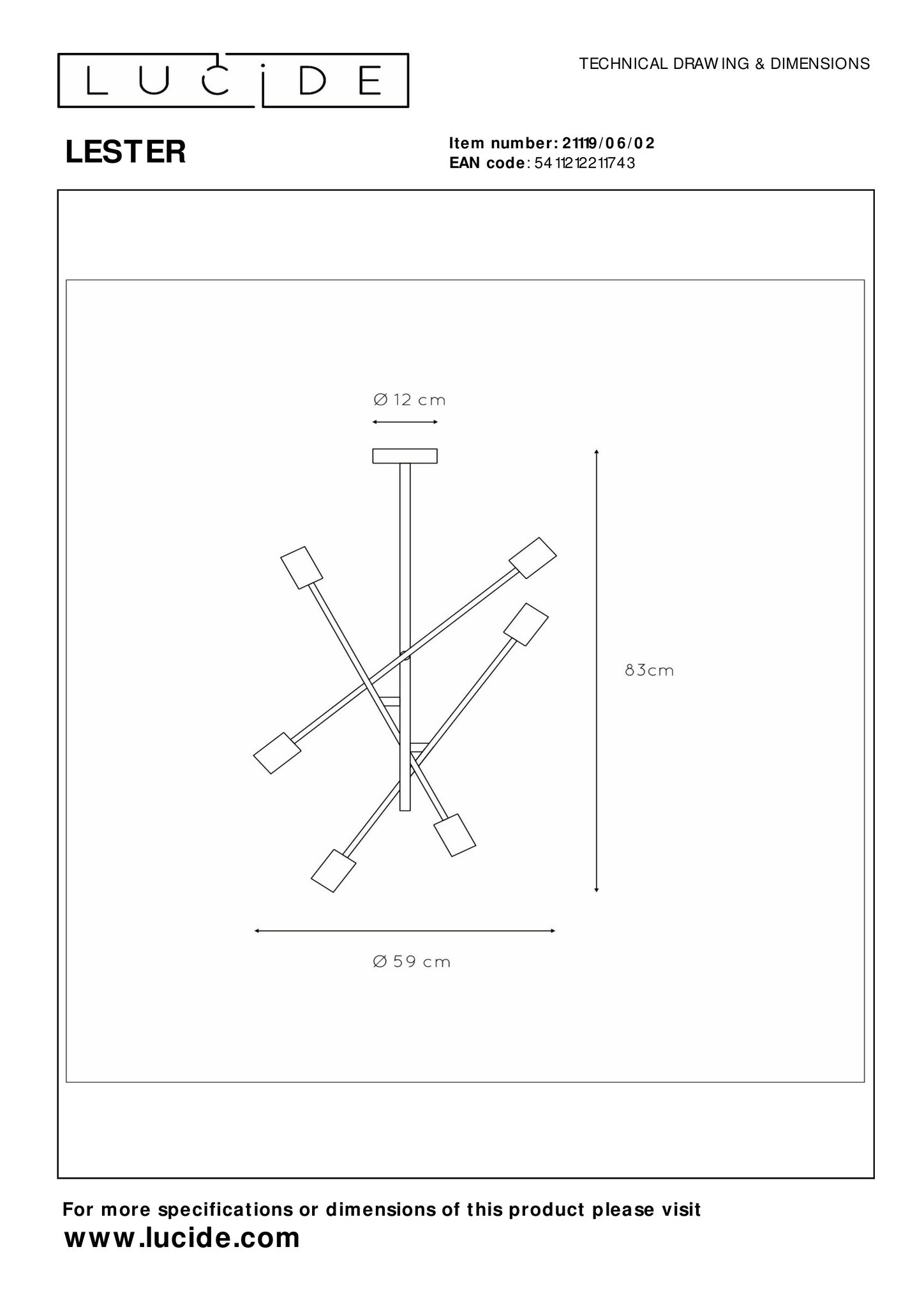 Modern, trendy ceiling lamp in black or matte gold brass, with 6 light sources. These light sources are rotatable via the rod with two of them attached. The lamp is 59 cm long x 59 cm wide x 83 cm high. Light sources not included. Recommended light source: Filament LED Lucide.
