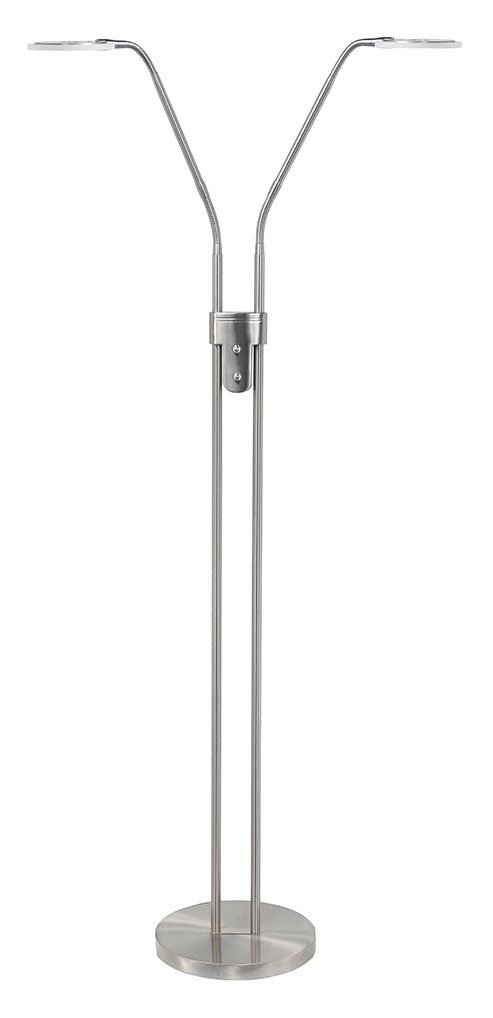 Rodeo reading lamp in black or stainless steel with a high light output. Max. height: 145 cm. This lamp uses approximately two 6.5-watt LEDs. It includes a dimmer in the center of the rod. The dimmer has a color-changing function (2700-4000 Kelvin). It has a reach of approximately 40 cm and two 585-lumen versions.