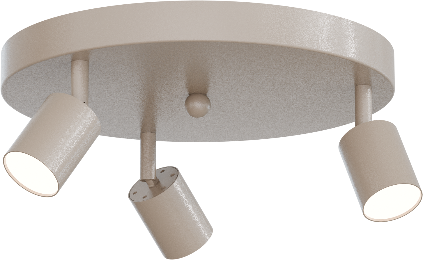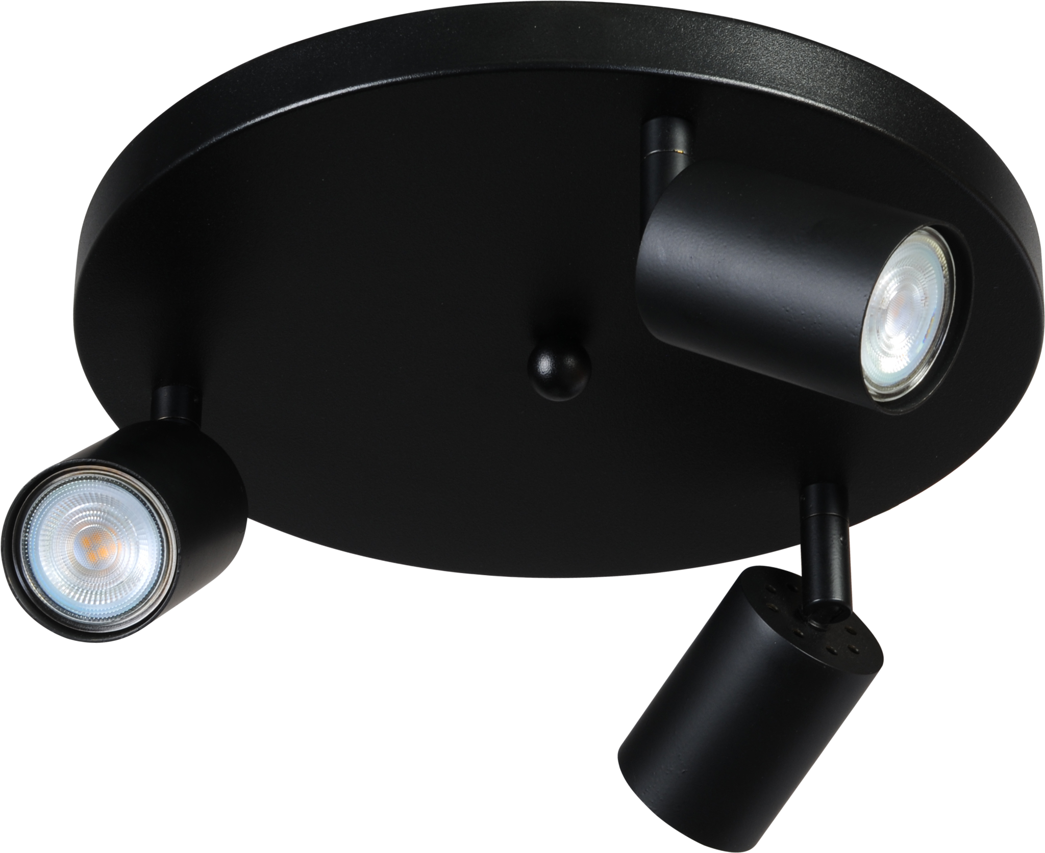 This beautifully finished round Bounce ceiling spotlight has a diameter of 30 cm and features three tilting and rotating spotlights in all black, black with matte gold, or matte nickel. This lamp can be supplied with or without dimmable Osram LED light sources.