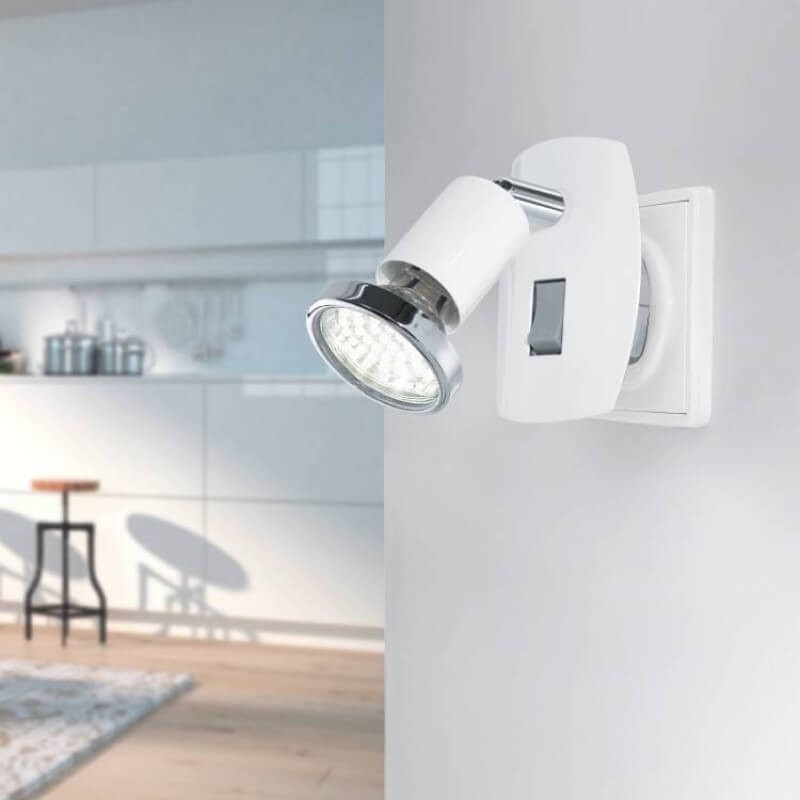 Plug-in wall lamp from Eglo, in white with chrome. The lamp has an on/off switch. It includes a 3-watt LED bulb, or for the black version, a replaceable 4.5-watt LED bulb. It provides good light and doesn't get very hot. The lamp can be rotated and tilted.