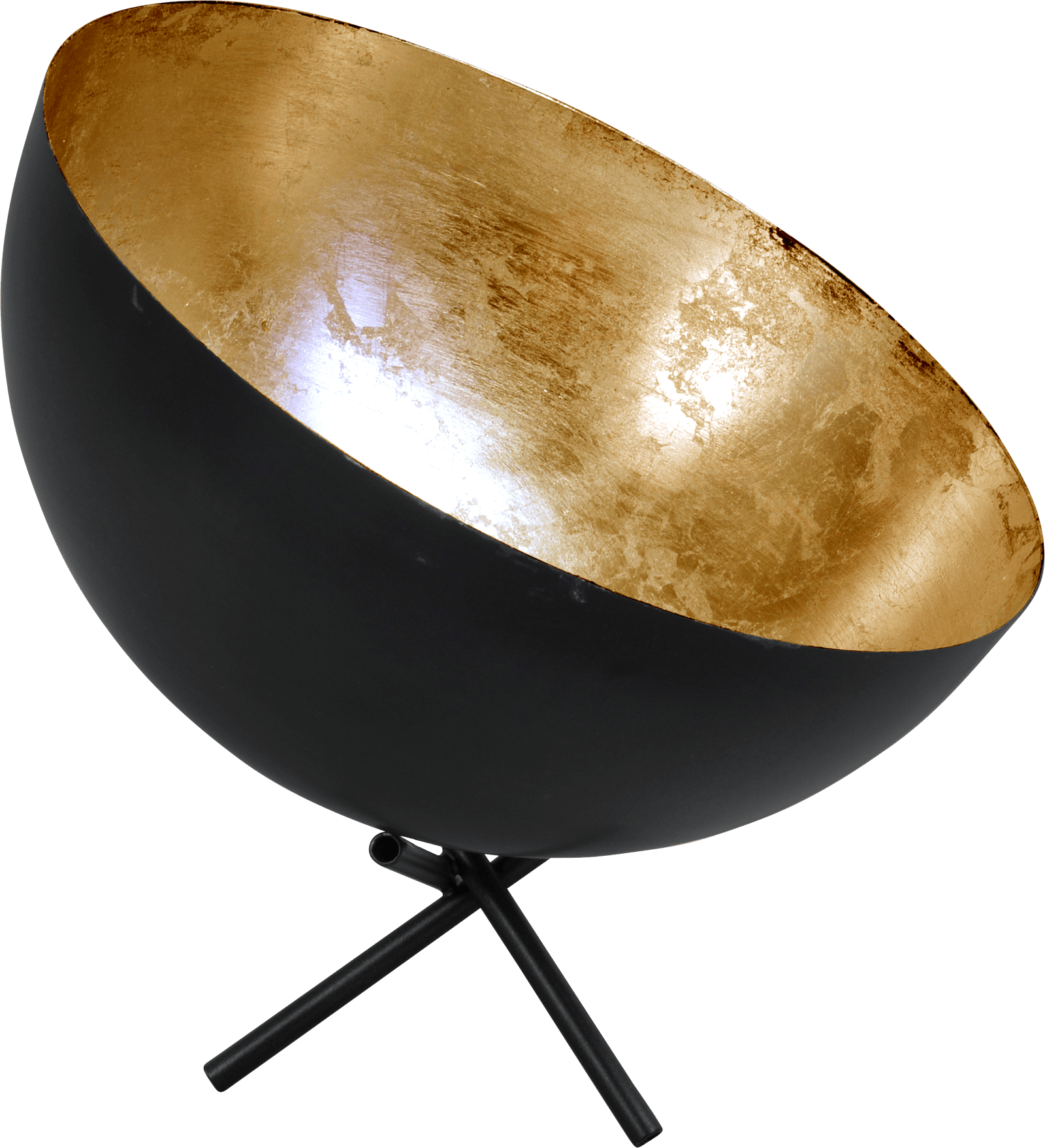 Larino table lamp with a black base and a black, round bowl with a 30 cm diameter, the inside of which is gold-colored. It can also be used as a standing lamp to illuminate a corner of the living room or bedroom. Height: 40 cm.