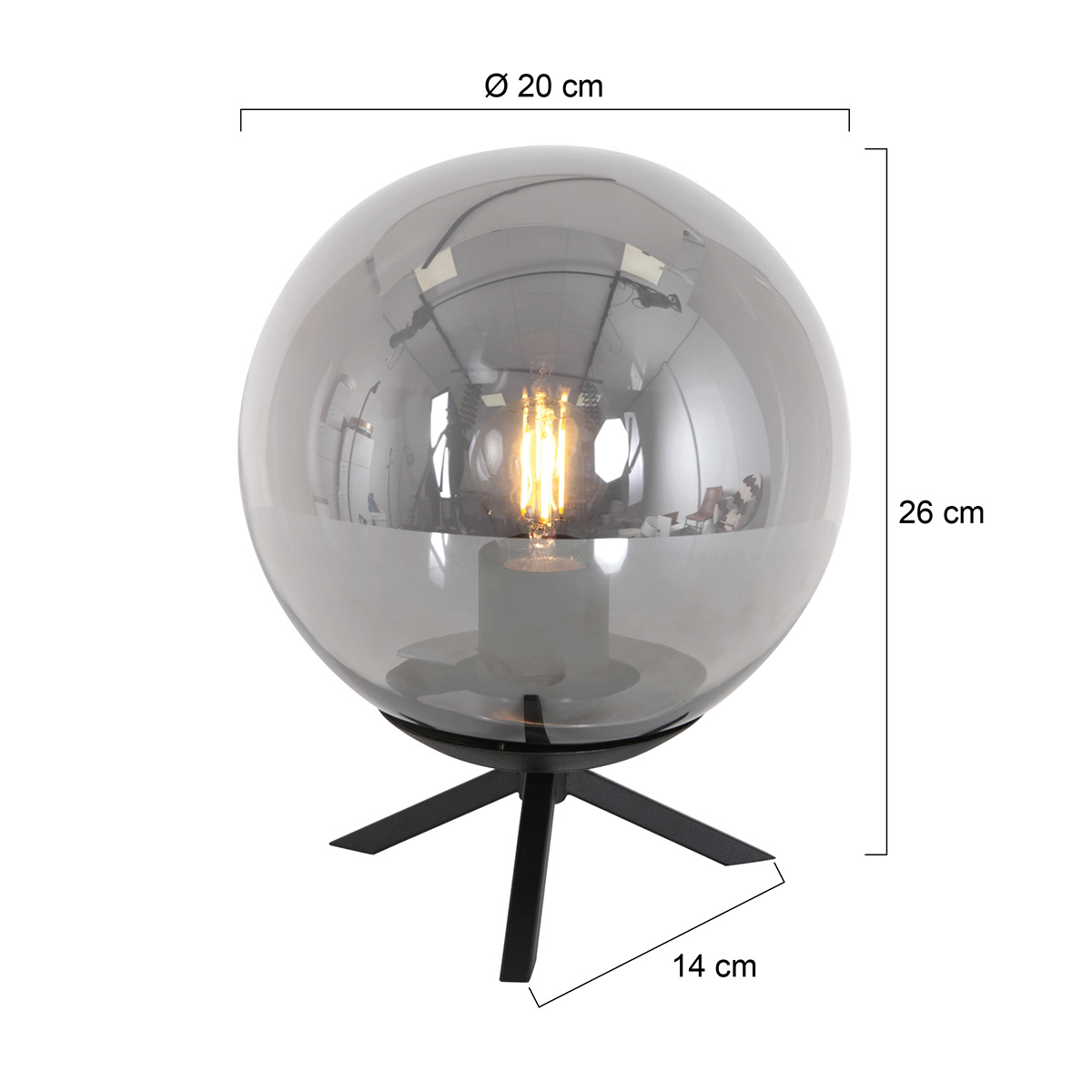 Bollique table lamp, a black tripod with a 20 cm smoke globe. On display in the store. Read more