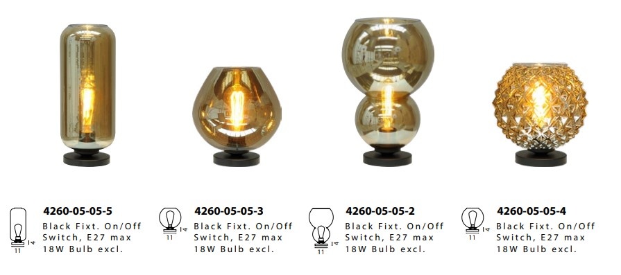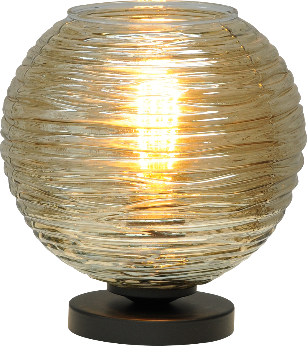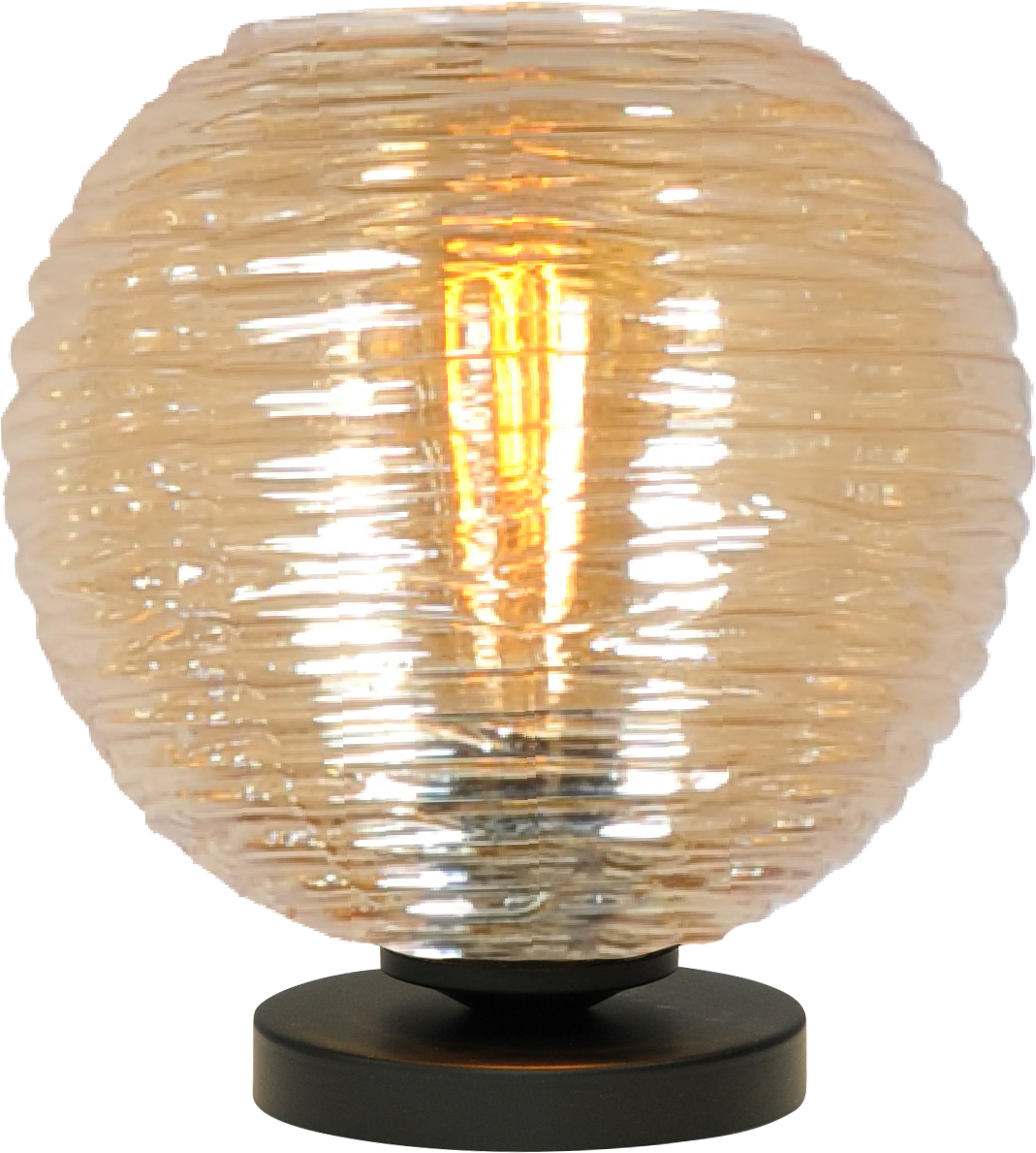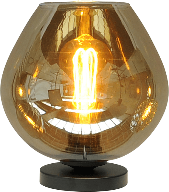 From the Quinto series, a table lamp with a round metal base with an amber or smoke ball (diameter 20 cm) or an elongated glass ball (29 x 13 cm). Very suitable for a filament LED lamp .