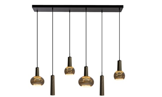 Rustic Dutch quality pendant lamp The Cone Bar, 4 x Cone spotlights 15 cm E27 / 2 x Cone spotlights 25 cm GU10, bronze color in the photo, but the cone pendant is also available in other colors. At 160 cm, the pendants are 15 and 35 cm long.