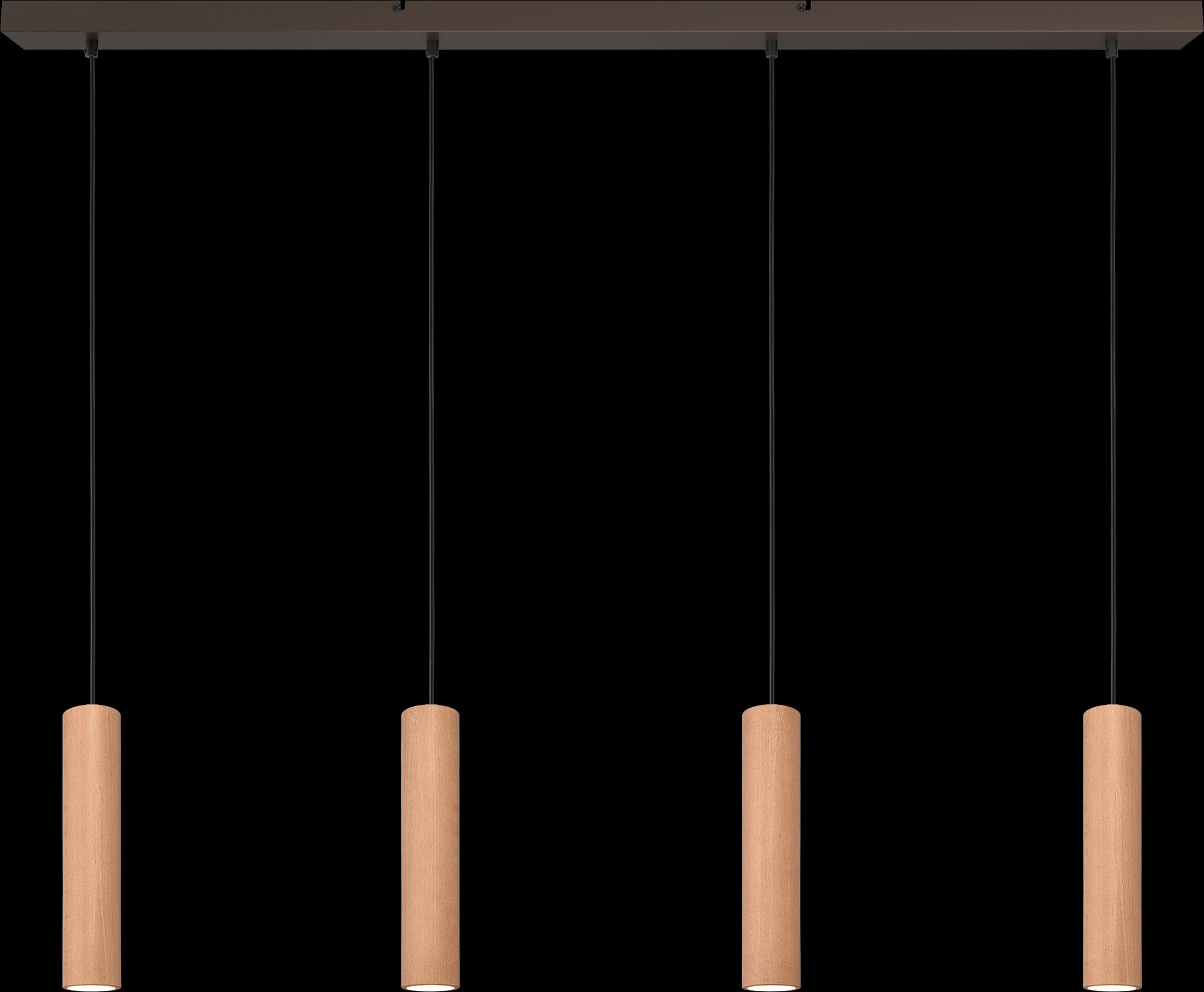 Four-light Tubino pendant lamp on a 130 x 8 cm beam. Ceiling plate available in black, terracotta, or cocoa. Read more