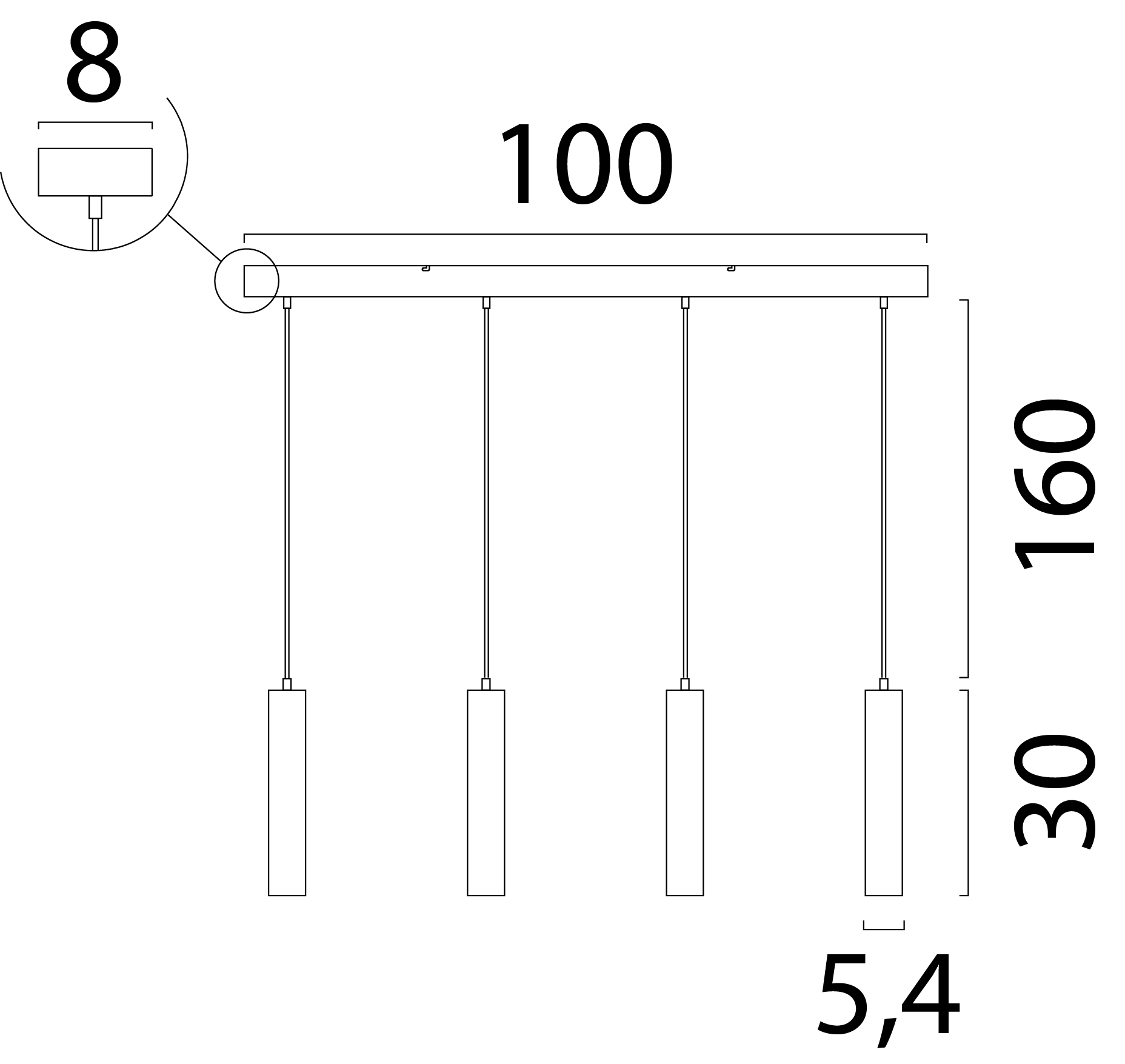 Hanging lamp Tubino 5 lights on a bar of 130 x 8 cm / 4 tubes natural oak, with a 5.4 cm diameter (30 cm long) the cables have a length of 145 cm. Suitable for a GU10 LED lamp (Excl) PVC cable.