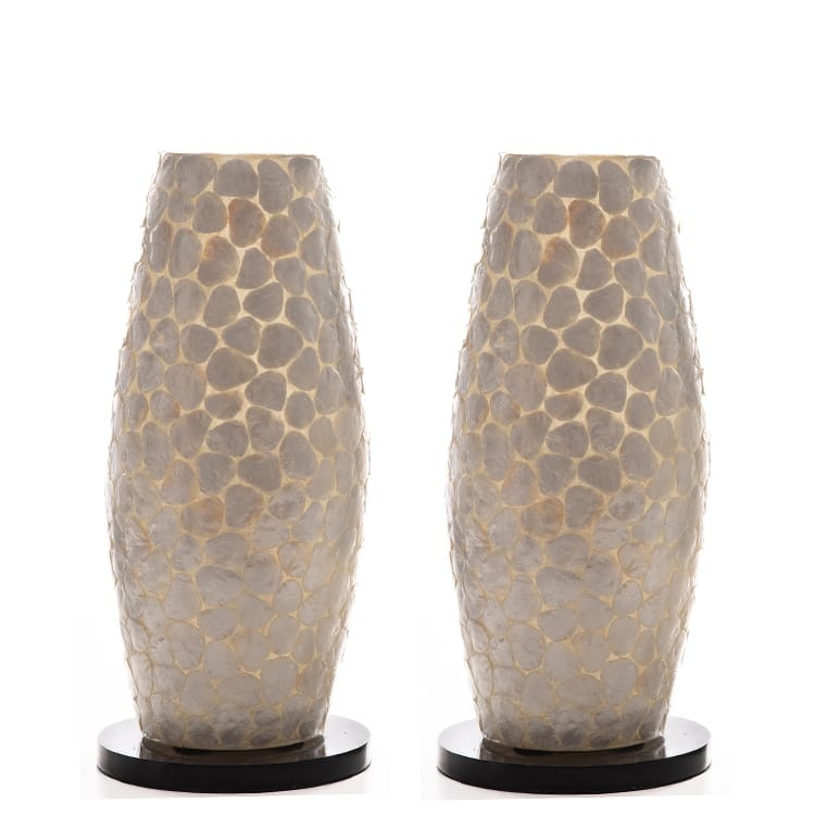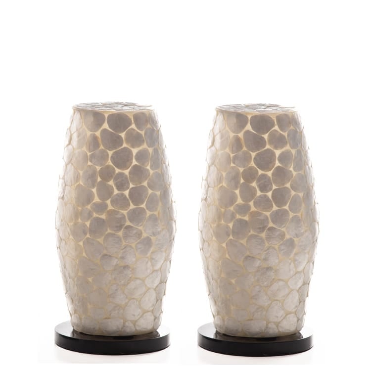 Turtle White table lamp in mother-of-pearl white. These lamps are covered with Capiz shells on a fiberglass mold. The height is 30 or 40 cm. Comes in a set of two. Each table lamp accepts a maximum 40-watt bulb with an E14 socket. It comes with a black cord and an on/off switch.