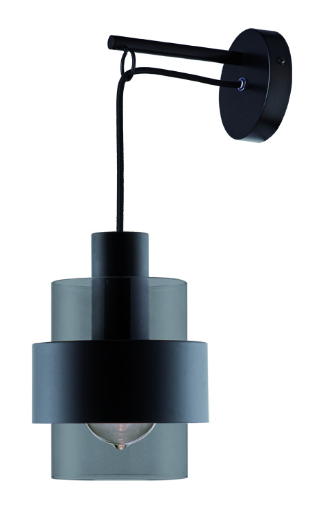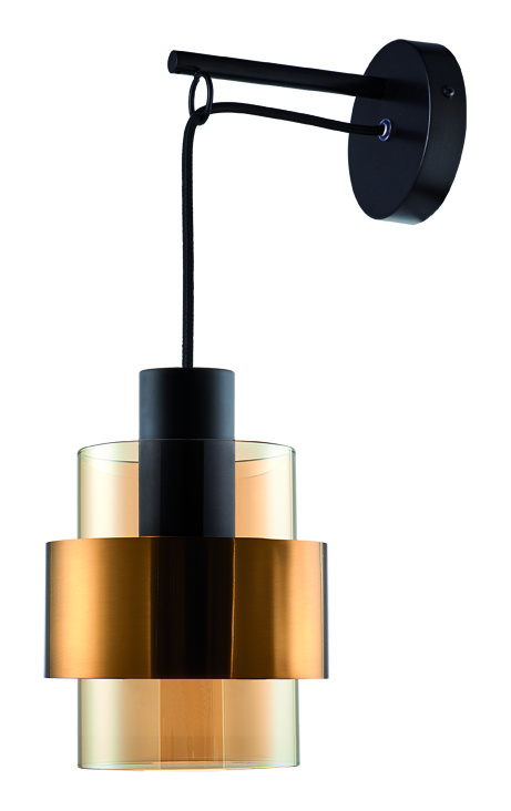 From the Chiasso series, the wall lamp is available in black with smoked glass or matte gold with amber glass. Height: 41 cm. A filament bulb completes this lamp. Glass dimensions: height 20 cm x diameter 13 cm. Wall plate: 11 cm.