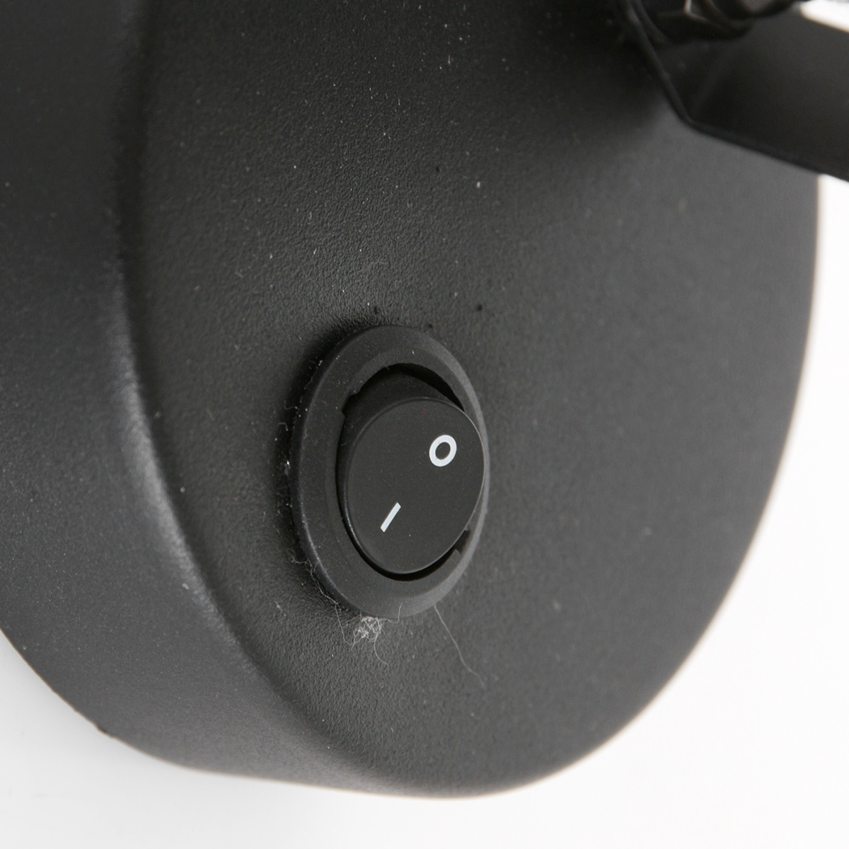 An industrial black wall lamp with a round black fabric shade and an on/off switch on the fixture. Read more