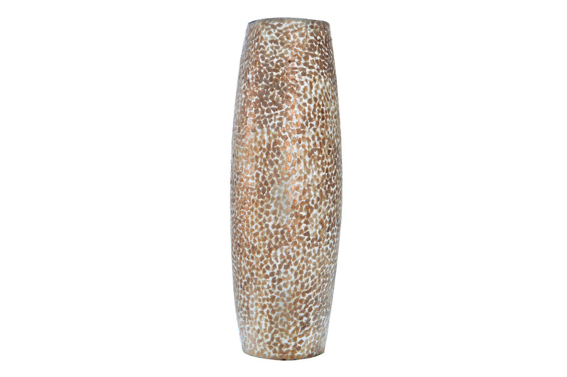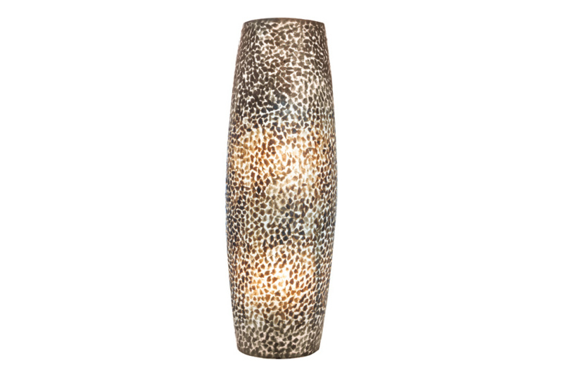 The Wangi Gold wall lamp features broken capiz shell pieces (a mix of cream, brown, and gold) on a fiberglass mold in an elongated shape. This wall lamp brings a warm atmosphere to your home. It is 55 cm high and suitable for two E14 LED bulbs. It comes complete with a white cord and on/off switch.