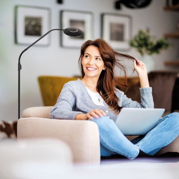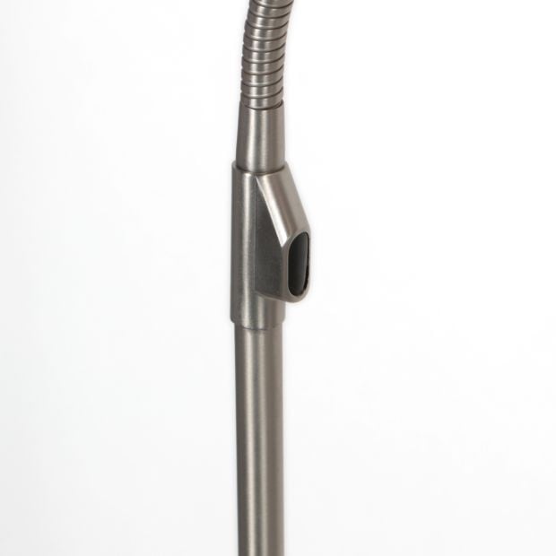 A steel floor lamp from the Zenith2 LED series. The lamp features a bendable arm and a tiltable shade. The fixture is made of metal. The lamp is equipped with a built-in 6-watt LED module, which is replaceable by the manufacturer. The maximum height is 150 centimeters. The shade has a diameter of 11 centimeters. The lamp can be operated via a pulse dimmer. Built-in replaceable LED module. Bendable at two points for optimal flexibility. The color temperature ranges from 2200 Kelvin to 4000 Kelvin with a light output of 700 lumens . Includes remote control.