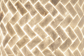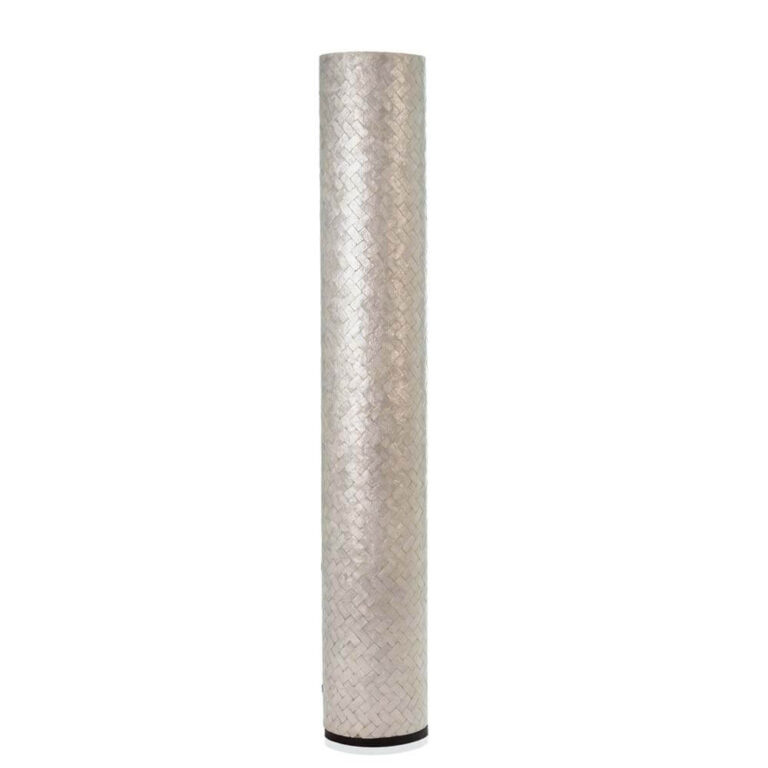 Zigzag floor lamp in mother-of-pearl white. These lamps are covered with Capiz shells on a fiberglass mold. The height is 150 cm and the diameter is 23 cm. This floor lamp accepts three LED bulbs with an E27 socket. (Not included)
