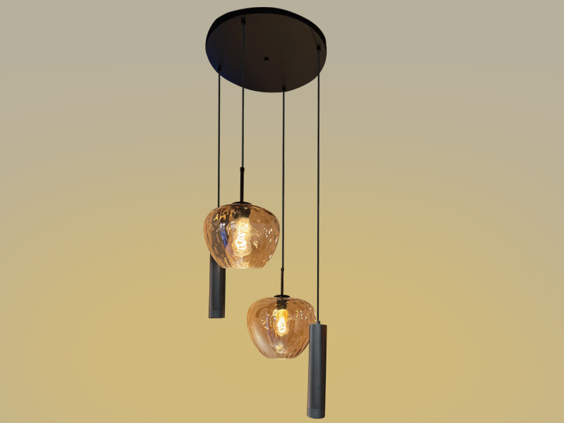 Hanglamp Apple 2 + 2 rond, met een zwarte plafondplaat van 40 cm doorsnede. Nieuw glas ( met kleine deukjes. Glas is verkrijgbaar in amber of grijs-smoke, met 2 tubes die ook 2 verschillende hoogte's heeft