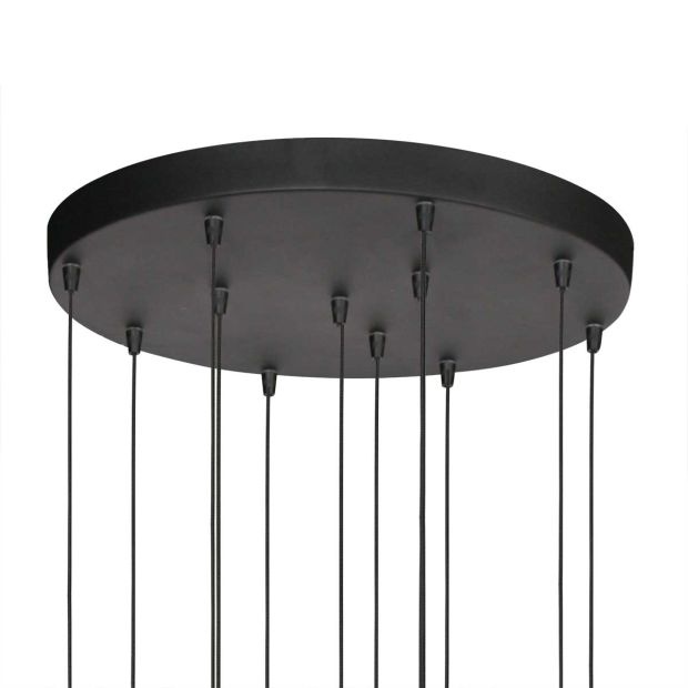 Plafondlamp Bollique New met 12 smoke glazen bollen. DE lamp bestaat uit 12 glazen bollen van 15 cm en 1 extra bol van 20 cm creëren een speels en luxueus lichteffect. Het spiegelende smoke zwarte glas geeft een verfijnde uitstraling en zorgt voor een sfeervolle lichtverspreiding. doorsnede. De maximale lengte van de lamp is 350 centimeter. De diameter van de plafondplaat is 40,5 cm. De geïntegreerde vervangbare LED-modules van 6 watt per bol leveren 600 lumen per lichtpunt met een warme lichtkleur van 2700K, ideaal voor een gezellige ambiance. Totale diameter van de lamp is 60 cm.