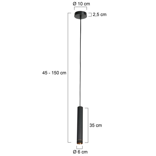 De DownLume 4215ZW is een elegante hanglamp met een minimalistisch ontwerp dat direct de aandacht trekt. De ronde, matzwarte koker van slechts 6 cm doorsnede en 41 cm hoogte hangt aan een stijlvol zwart strijkijzersnoer, wat zorgt voor een verfijnde uitstraling. Aan de onderzijde verrast de lamp met een subtiele gouden binnenkant en een smal gouden randje.