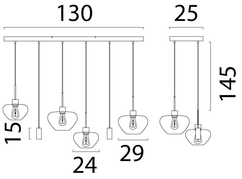 Deze schitterende en van mooie kwaliteit 6 lichts hanglamp Genua. Een royale zwarte of cacao plafondplaat van 130 x 25 cm met daaraan 4 gold fading glazen bollen met een diameter van 15, 24 cm, en 29 cm, en 2 x kokers eraan.